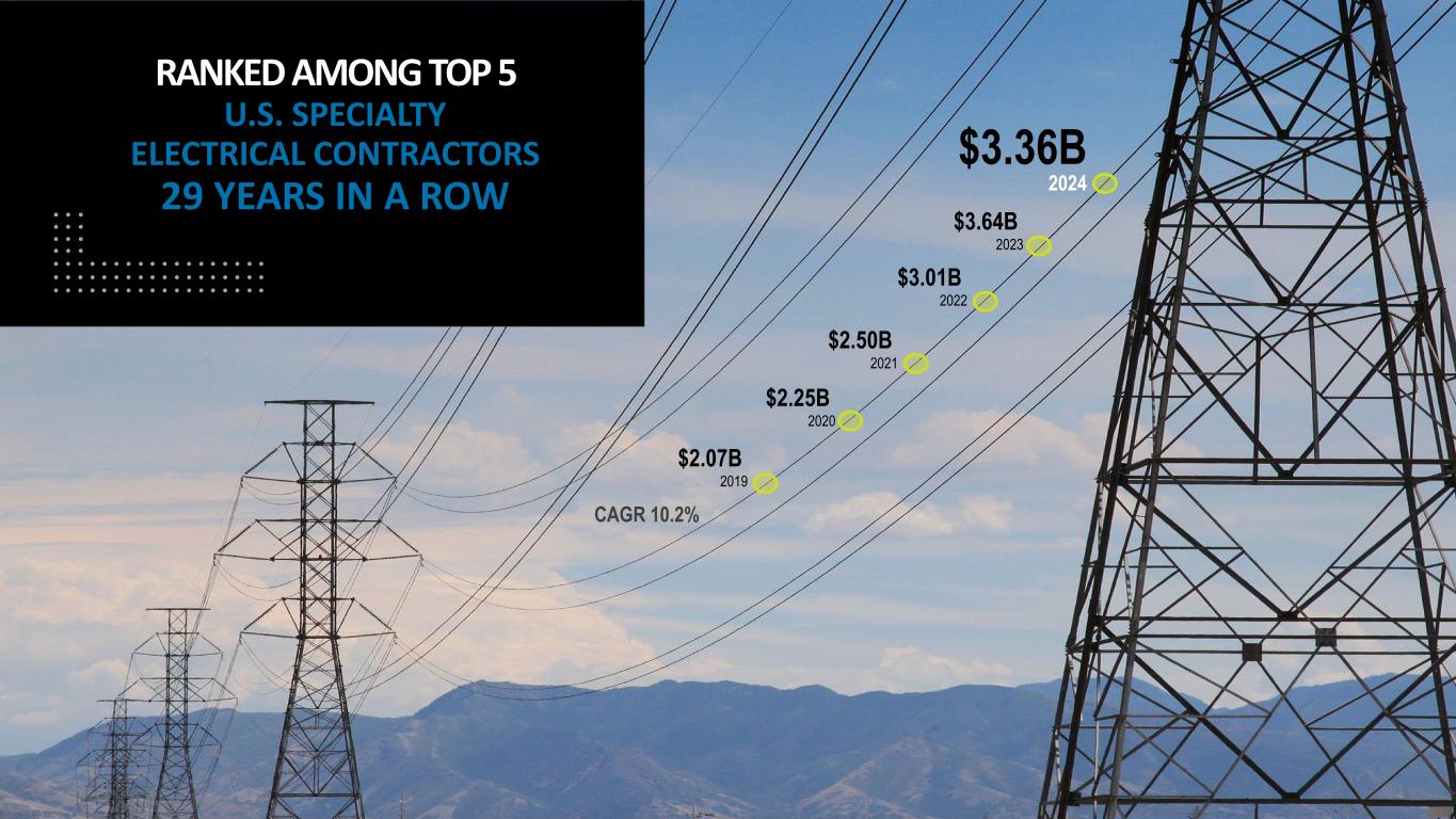 4 $3.36B 2024 $2.07B 2019 $2.25B 2020 $2.50B 2021 $3.64B 2023 RANKED AMONG TOP 5 U.S. SPECIALTY ELECTRICAL CONTRACTORS 29 YEARS IN A ROW $3.01B 2022 CAGR 10.2%