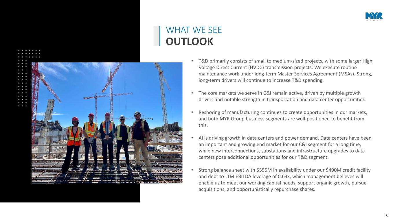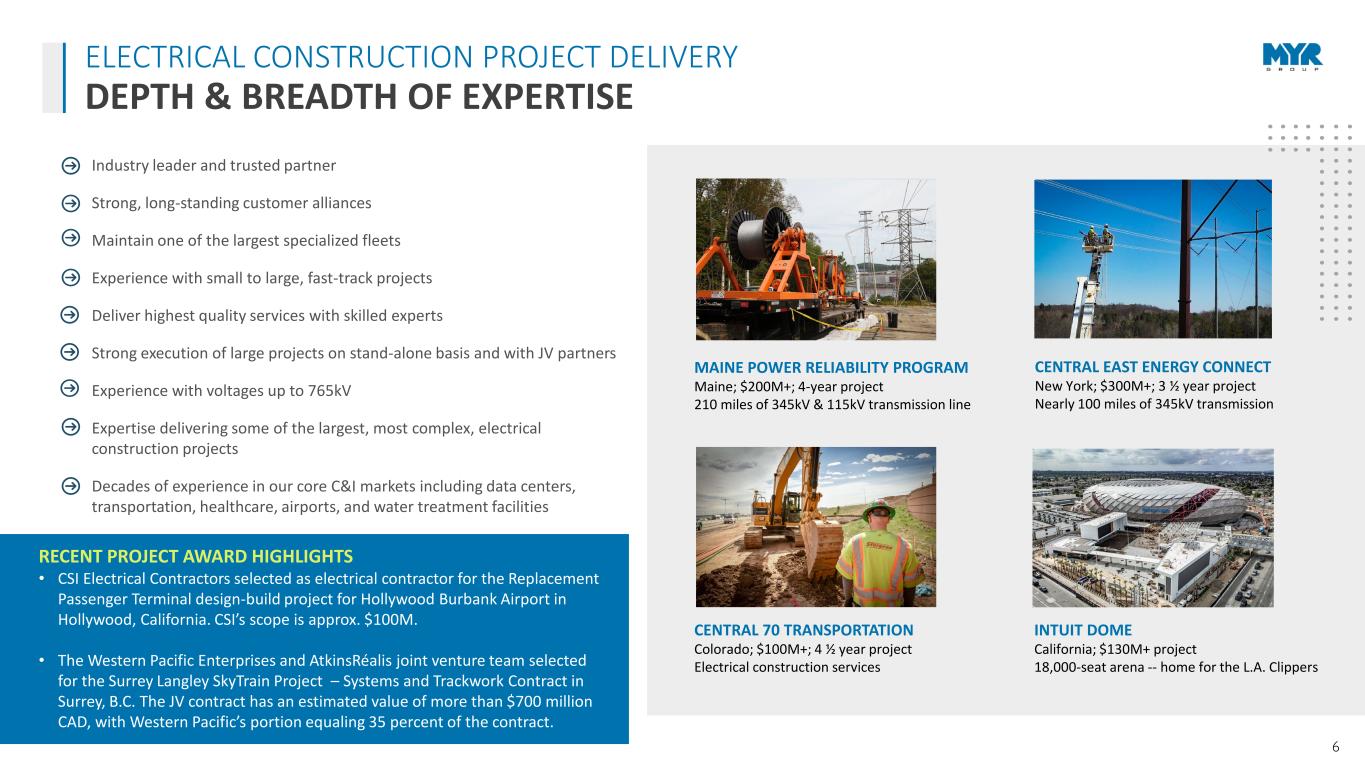 5 • T&D primarily consists of small to medium-sized projects, with some larger High Voltage Direct Current (HVDC) transmission projects. We execute routine maintenance work under long-term Master Services Agreement (MSAs). Strong, long-term drivers will continue to increase T&D spending. • The core markets we serve in C&I remain active, driven by multiple growth drivers and notable strength in transportation and data center opportunities. • Reshoring of manufacturing continues to create opportunities in our markets, and both MYR Group business segments are well-positioned to benefit from this. • AI is driving growth in data centers and power demand. Data centers have been an important and growing end market for our C&I segment for a long time, while new interconnections, substations and infrastructure upgrades to data centers pose additional opportunities for our T&D segment. • Strong balance sheet with $355M in availability under our $490M credit facility and debt to LTM EBITDA leverage of 0.63x, which management believes will enable us to meet our working capital needs, support organic growth, pursue acquisitions, and opportunistically repurchase shares. WHAT WE SEE OUTLOOK