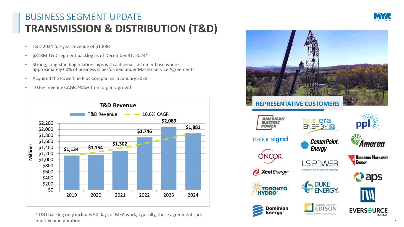 6 ELECTRICAL CONSTRUCTION PROJECT DELIVERY DEPTH & BREADTH OF EXPERTISE Industry leader and trusted partner Strong, long-standing customer alliances Maintain one of the largest specialized fleets Experience with small to large, fast-track projects Deliver highest quality services with skilled experts Strong execution of large projects on stand-alone basis and with JV partners Experience with voltages up to 765kV Expertise delivering some of the largest, most complex, electrical construction projects Decades of experience in our core C&I markets including data centers, transportation, healthcare, airports, and water treatment facilities MAINE POWER RELIABILITY PROGRAM Maine; $200M+; 4-year project 210 miles of 345kV & 115kV transmission line CENTRAL 70 TRANSPORTATION Colorado; $100M+; 4 ½ year project Electrical construction services CENTRAL EAST ENERGY CONNECT New York; $300M+; 3 ½ year project Nearly 100 miles of 345kV transmission INTUIT DOME California; $130M+ project 18,000-seat arena -- home for the L.A. Clippers RECENT PROJECT AWARD HIGHLIGHTS • CSI Electrical Contractors selected as electrical contractor for the Replacement Passenger Terminal design-build project for Hollywood Burbank Airport in Hollywood, California. CSI’s scope is approx. $100M. • The Western Pacific Enterprises and AtkinsRéalis joint venture team selected for the Surrey Langley SkyTrain Project – Systems and Trackwork Contract in Surrey, B.C. The JV contract has an estimated value of more than $700 million CAD, with Western Pacific’s portion equaling 35 percent of the contract.