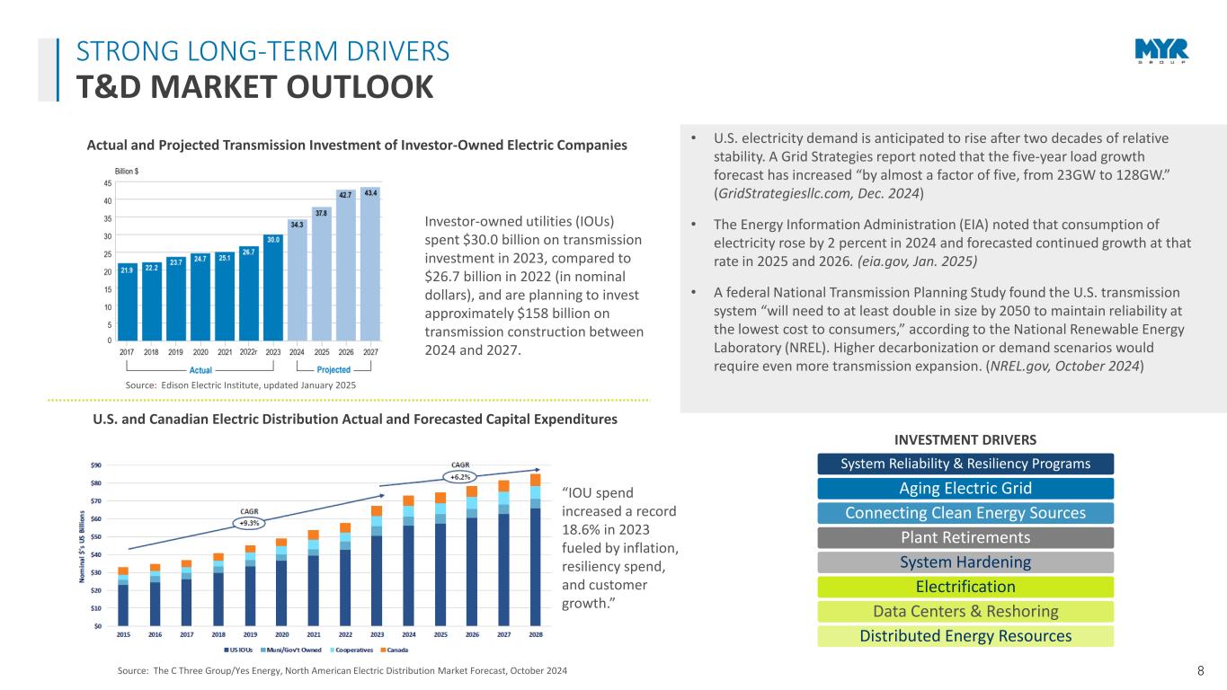 7 • T&D 2024 full-year revenue of $1.88B • $818M T&D segment backlog as of December 31, 2024* • Strong, long-standing relationships with a diverse customer base where approximately 60% of business is performed under Master Service Agreements • Acquired the Powerline Plus Companies in January 2022 • 10.6% revenue CAGR, 90%+ from organic growth BUSINESS SEGMENT UPDATE TRANSMISSION & DISTRIBUTION (T&D) REPRESENTATIVE CUSTOMERS $1,134 $1,154 $1,302 $1,746 $2,089 $1,881 $0 $200 $400 $600 $800 $1,000 $1,200 $1,400 $1,600 $1,800 $2,000 $2,200 2019 2020 2021 2022 2023 2024 M ill io ns T&D Revenue T&D Revenue 10.6% CAGR *T&D backlog only includes 90 days of MSA work; typically, these agreements are multi-year in duration
