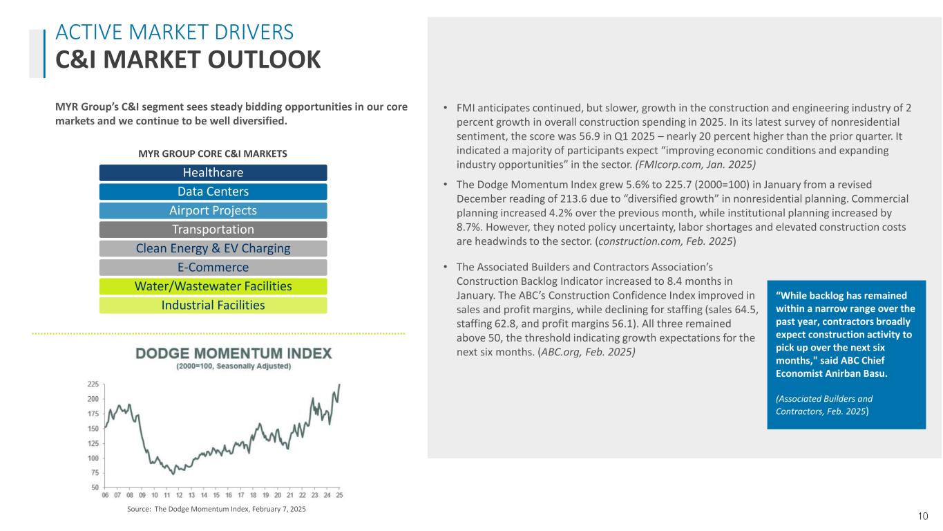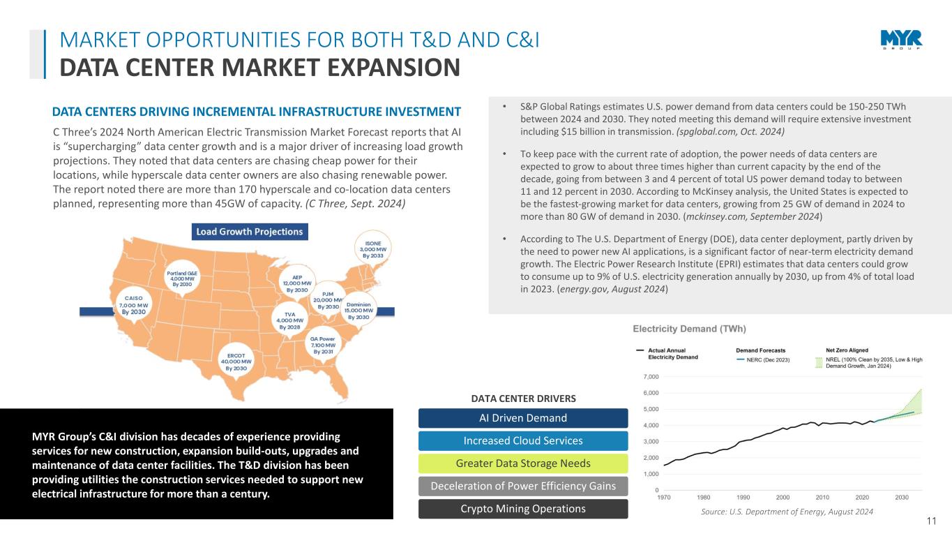 10 Healthcare Data Centers Airport Projects Transportation Clean Energy & EV Charging E-Commerce Water/Wastewater Facilities Industrial Facilities MYR GROUP CORE C&I MARKETS ACTIVE MARKET DRIVERS C&I MARKET OUTLOOK • FMI anticipates continued, but slower, growth in the construction and engineering industry of 2 percent growth in overall construction spending in 2025. In its latest survey of nonresidential sentiment, the score was 56.9 in Q1 2025 – nearly 20 percent higher than the prior quarter. It indicated a majority of participants expect “improving economic conditions and expanding industry opportunities” in the sector. (FMIcorp.com, Jan. 2025) • The Dodge Momentum Index grew 5.6% to 225.7 (2000=100) in January from a revised December reading of 213.6 due to “diversified growth” in nonresidential planning. Commercial planning increased 4.2% over the previous month, while institutional planning increased by 8.7%. However, they noted policy uncertainty, labor shortages and elevated construction costs are headwinds to the sector. (construction.com, Feb. 2025) Source: The Dodge Momentum Index, February 7, 2025 MYR Group’s C&I segment sees steady bidding opportunities in our core markets and we continue to be well diversified. “While backlog has remained within a narrow range over the past year, contractors broadly expect construction activity to pick up over the next six months," said ABC Chief Economist Anirban Basu. (Associated Builders and Contractors, Feb. 2025) • The Associated Builders and Contractors Association’s Construction Backlog Indicator increased to 8.4 months in January. The ABC’s Construction Confidence Index improved in sales and profit margins, while declining for staffing (sales 64.5, staffing 62.8, and profit margins 56.1). All three remained above 50, the threshold indicating growth expectations for the next six months. (ABC.org, Feb. 2025)