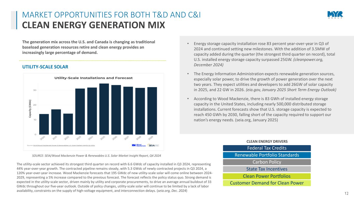 11 MARKET OPPORTUNITIES FOR BOTH T&D AND C&I DATA CENTER MARKET EXPANSION AI Driven Demand Increased Cloud Services Greater Data Storage Needs Deceleration of Power Efficiency Gains Crypto Mining Operations DATA CENTER DRIVERS DATA CENTERS DRIVING INCREMENTAL INFRASTRUCTURE INVESTMENT C Three’s 2024 North American Electric Transmission Market Forecast reports that AI is “supercharging” data center growth and is a major driver of increasing load growth projections. They noted that data centers are chasing cheap power for their locations, while hyperscale data center owners are also chasing renewable power. The report noted there are more than 170 hyperscale and co-location data centers planned, representing more than 45GW of capacity. (C Three, Sept. 2024) • S&P Global Ratings estimates U.S. power demand from data centers could be 150-250 TWh between 2024 and 2030. They noted meeting this demand will require extensive investment including $15 billion in transmission. (spglobal.com, Oct. 2024) • To keep pace with the current rate of adoption, the power needs of data centers are expected to grow to about three times higher than current capacity by the end of the decade, going from between 3 and 4 percent of total US power demand today to between 11 and 12 percent in 2030. According to McKinsey analysis, the United States is expected to be the fastest-growing market for data centers, growing from 25 GW of demand in 2024 to more than 80 GW of demand in 2030. (mckinsey.com, September 2024) • According to The U.S. Department of Energy (DOE), data center deployment, partly driven by the need to power new AI applications, is a significant factor of near-term electricity demand growth. The Electric Power Research Institute (EPRI) estimates that data centers could grow to consume up to 9% of U.S. electricity generation annually by 2030, up from 4% of total load in 2023. (energy.gov, August 2024) MYR Group’s C&I division has decades of experience providing services for new construction, expansion build-outs, upgrades and maintenance of data center facilities. The T&D division has been providing utilities the construction services needed to support new electrical infrastructure for more than a century. Source: U.S. Department of Energy, August 2024