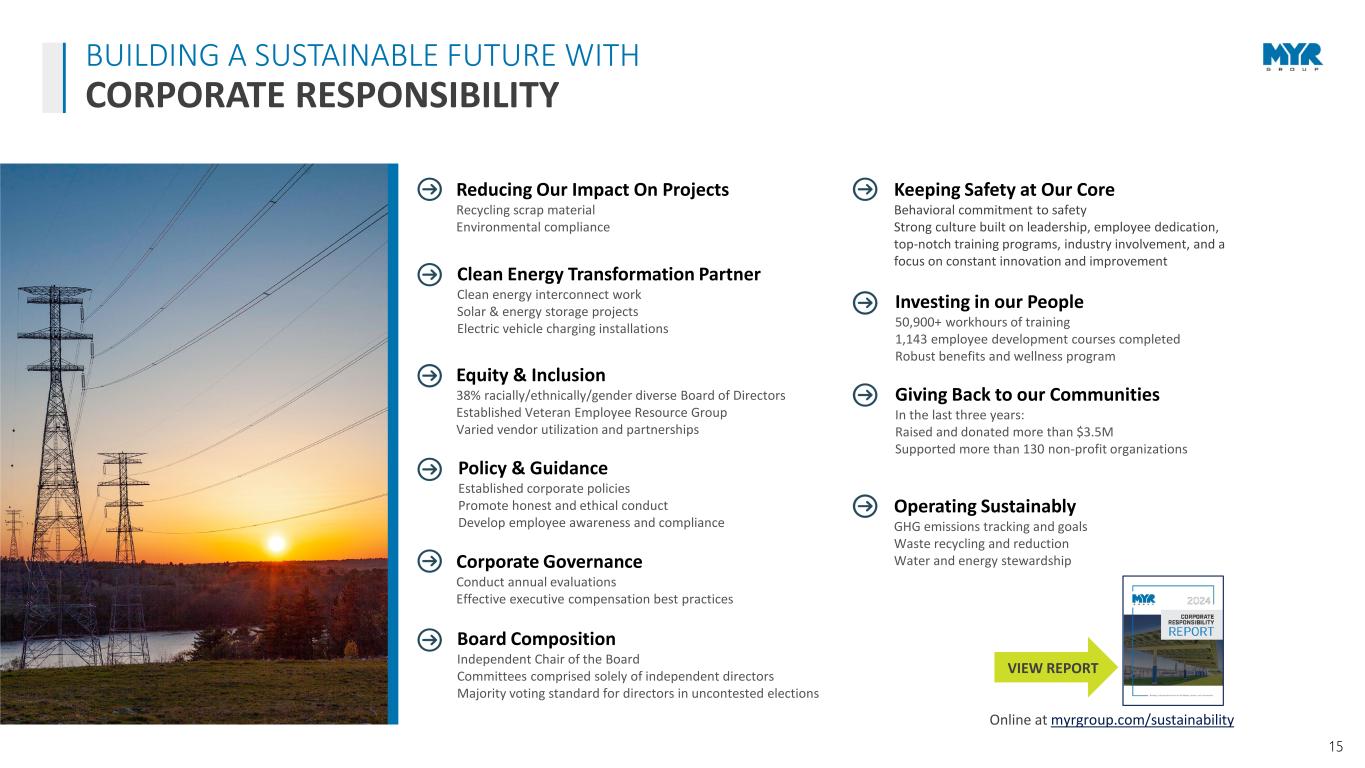 14 STRONG MARKET COUPLED WITH OUR COMPETITIVE EDGE POSITIONS MYR GROUP FOR CONTINUED GROWTH Healthy organic and acquisitive growth Proven execution of corporate strategy Strong financial position Centralized operations for greater efficiency and cross-collaboration Strong presence in key markets with expanding geographic footprint Future-driven mindset to deploy new systems and technologies Broadening our capabilities to support the development of clean energy infrastructure Experienced leadership team Reputation for excellence with customers, with more than 90% return clients in both segments Diversified customer base with no client or contract representing more that 10% of revenue INVESTMENT HIGHLIGHTS U.S./Canada Long-term growth both organically and via acquisition T&D Transmission market outlook strong next 5+ years C&I Well-diversified C&I sector (Transportation, Healthcare, Data Center, Manufacturing) Clean Energy Clean energy initiatives driving increased construction spend MYR GROUP STRATEGIC IMPERATIVES FINANCIAL STRENGTH Deliver positive financial results on a consistent basis while positioning the company for growth ORGANIZATIONAL EXCELLENCE Sustain a culture that aids in attracting, retaining, and developing the best people in the industry OPERATIONAL EXCELLENCE Continue investments in people, equipment, health, safety, the environment, technology, innovative programs, process improvement, and sustainability CUSTOMER SATISFACTION Strive to always be the first choice for our clients and remain one of the most reliable, efficient, and high-value providers STRATEGIC GROWTH