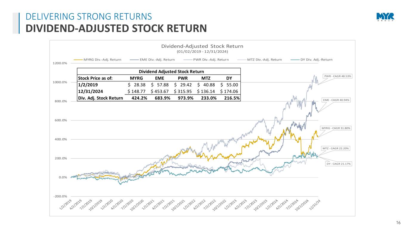 15 BUILDING A SUSTAINABLE FUTURE WITH CORPORATE RESPONSIBILITY VIEW REPORT Policy & Guidance Established corporate policies Promote honest and ethical conduct Develop employee awareness and compliance Equity & Inclusion 38% racially/ethnically/gender diverse Board of Directors Established Veteran Employee Resource Group Varied vendor utilization and partnerships Reducing Our Impact On Projects Recycling scrap material Environmental compliance Clean Energy Transformation Partner Clean energy interconnect work Solar & energy storage projects Electric vehicle charging installations Giving Back to our Communities In the last three years: Raised and donated more than $3.5M Supported more than 130 non-profit organizations Operating Sustainably GHG emissions tracking and goals Waste recycling and reduction Water and energy stewardship Investing in our People 50,900+ workhours of training 1,143 employee development courses completed Robust benefits and wellness program Board Composition Independent Chair of the Board Committees comprised solely of independent directors Majority voting standard for directors in uncontested elections Corporate Governance Conduct annual evaluations Effective executive compensation best practices Keeping Safety at Our Core Behavioral commitment to safety Strong culture built on leadership, employee dedication, top-notch training programs, industry involvement, and a focus on constant innovation and improvement Online at myrgroup.com/sustainability