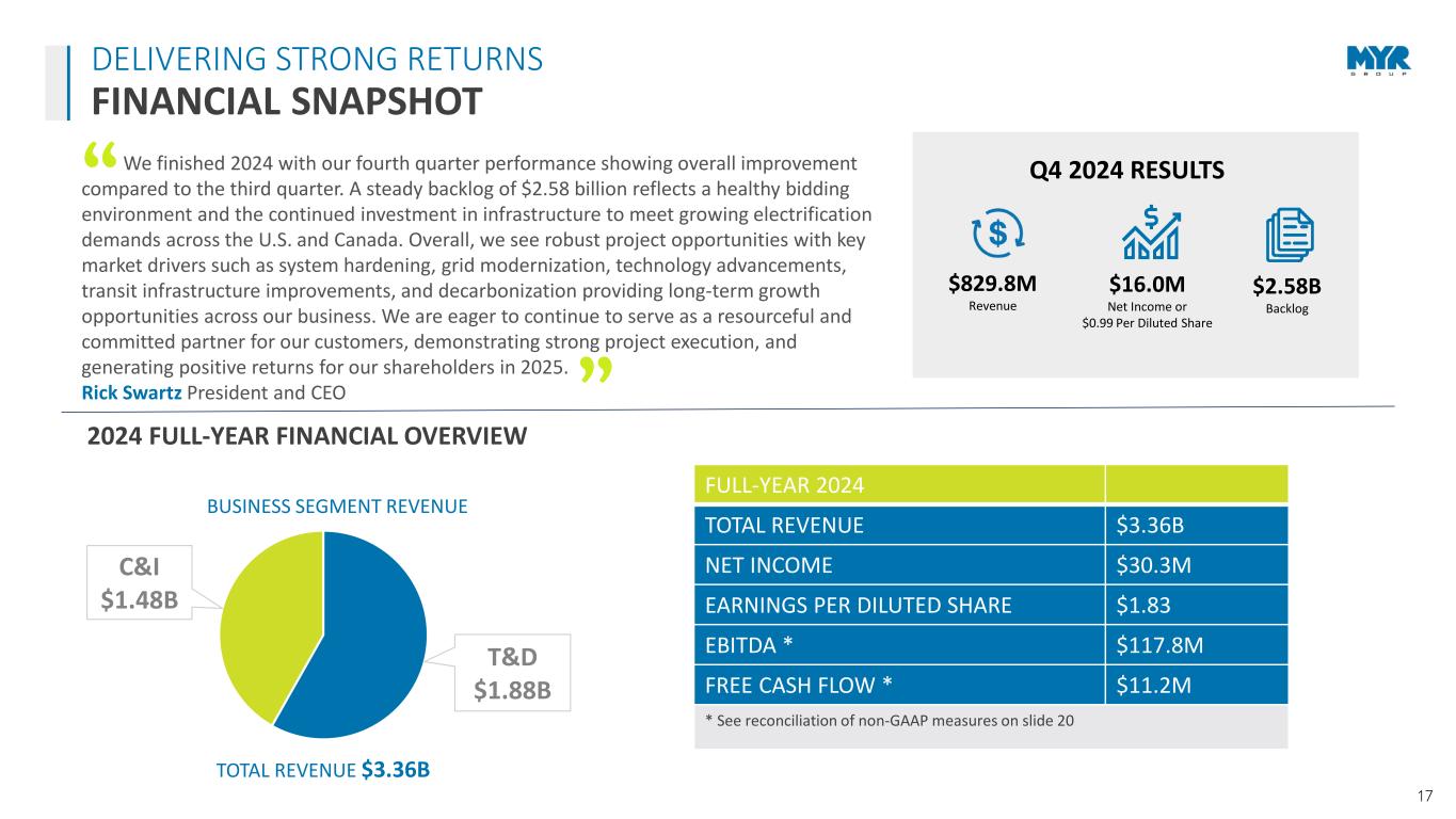 16 DELIVERING STRONG RETURNS DIVIDEND-ADJUSTED STOCK RETURN MYRG - CAGR 31.80% EME - CAGR 40.94% PWR - CAGR 48.53% MTZ - CAGR 22.20% DY - CAGR 21.17% -200.0% 0.0% 200.0% 400.0% 600.0% 800.0% 1000.0% 1200.0% Dividend-Adjusted Stock Return (01/02/2019 - 12/31/2024) MYRG Div.-Adj. Return EME Div.-Adj. Return PWR Div.-Adj. Return MTZ Div.-Adj. Return DY Div. Adj.-Return Dividend Adjusted Stock Return Stock Price as of: MYRG EME PWR MTZ DY 1/2/2019 28.38$ 57.88$ 29.42$ 40.88$ 55.00$ 12/31/2024 148.77$ 453.67$ 315.95$ 136.14$ 174.06$ Div. Adj. Stock Return 424.2% 683.9% 973.9% 233.0% 216.5%