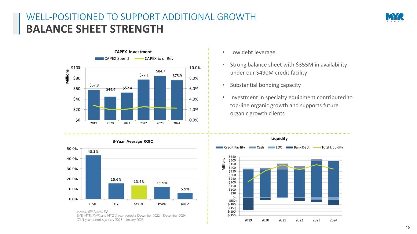 17 Q4 2024 RESULTS $16.0M Net Income or $0.99 Per Diluted Share $2.58B Backlog $829.8M Revenue We finished 2024 with our fourth quarter performance showing overall improvement compared to the third quarter. A steady backlog of $2.58 billion reflects a healthy bidding environment and the continued investment in infrastructure to meet growing electrification demands across the U.S. and Canada. Overall, we see robust project opportunities with key market drivers such as system hardening, grid modernization, technology advancements, transit infrastructure improvements, and decarbonization providing long-term growth opportunities across our business. We are eager to continue to serve as a resourceful and committed partner for our customers, demonstrating strong project execution, and generating positive returns for our shareholders in 2025. Rick Swartz President and CEO “ ” DELIVERING STRONG RETURNS FINANCIAL SNAPSHOT T&D $1.88B C&I $1.48B BUSINESS SEGMENT REVENUE FULL-YEAR 2024 TOTAL REVENUE $3.36B NET INCOME $30.3M EARNINGS PER DILUTED SHARE $1.83 EBITDA * $117.8M FREE CASH FLOW * $11.2M * See reconciliation of non-GAAP measures on slide 20 2024 FULL-YEAR FINANCIAL OVERVIEW TOTAL REVENUE $3.36B