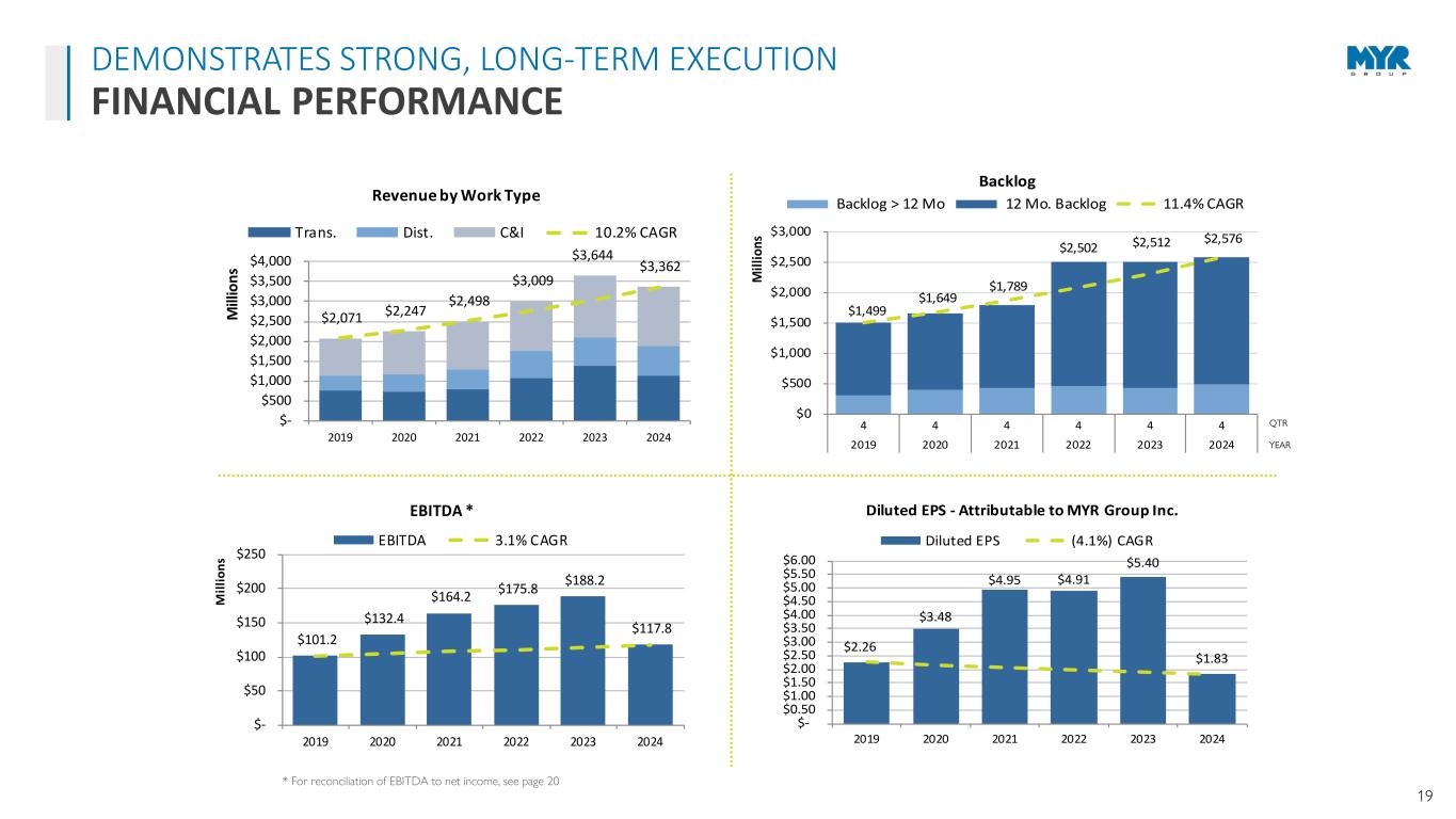 18 $57.8 $44.4 $52.4 $77.1 $84.7 $75.9 0.0% 2.0% 4.0% 6.0% 8.0% 10.0% $0 $20 $40 $60 $80 $100 2019 2020 2021 2022 2023 2024 M ill io ns CAPEX Investment CAPEX Spend CAPEX % of Rev 43.3% 15.6% 13.4% 11.9% 5.9% 0.0% 10.0% 20.0% 30.0% 40.0% 50.0% EME DY MYRG PWR MTZ 3-Year Average ROIC $(250) $(200) $(150) $(100) $(50) $- $50 $100 $150 $200 $250 $300 $350 $400 $450 $500 $550 2019 2020 2021 2022 2023 2024 M ill io ns Liquidity Credit Facility Cash LOC Bank Debt Total Liquidity Source: S&P Capital IQ EME, MYR, PWR, and MTZ 3-year period is December 2022 – December 2024 DY 3-year period is January 2023 – January 2025 • Low debt leverage • Strong balance sheet with $355M in availability under our $490M credit facility • Substantial bonding capacity • Investment in specialty equipment contributed to top-line organic growth and supports future organic growth clients WELL-POSITIONED TO SUPPORT ADDITIONAL GROWTH BALANCE SHEET STRENGTH
