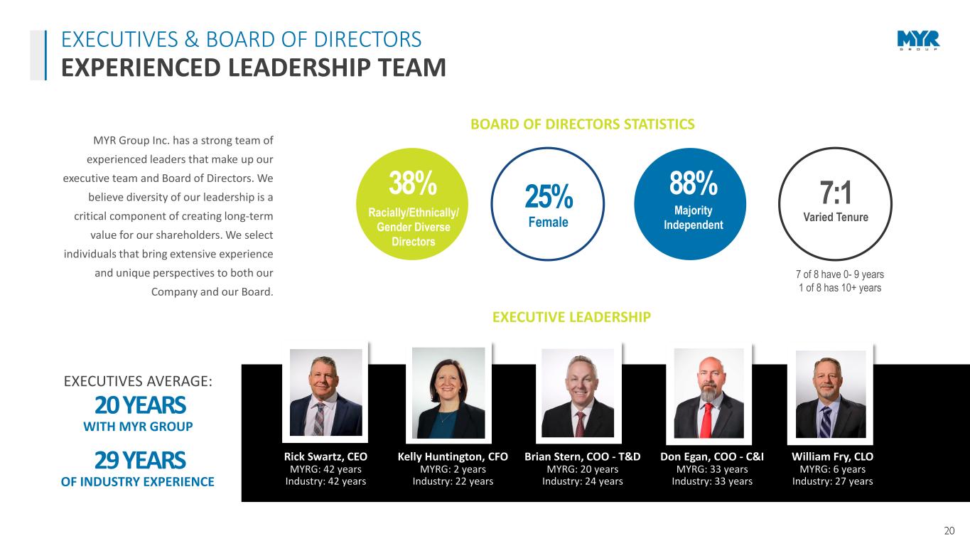 19 $2,071 $2,247 $2,498 $3,009 $3,644 $3,362 $- $500 $1,000 $1,500 $2,000 $2,500 $3,000 $3,500 $4,000 2019 2020 2021 2022 2023 2024 M ill io ns Revenue by Work Type Trans. Dist. C&I 10.2% CAGR $1,499 $1,649 $1,789 $2,502 $2,512 $2,576 $0 $500 $1,000 $1,500 $2,000 $2,500 $3,000 4 4 4 4 4 4 2019 2020 2021 2022 2023 2024 M ill io ns Backlog Backlog > 12 Mo 12 Mo. Backlog 11.4% CAGR $101.2 $132.4 $164.2 $175.8 $188.2 $117.8 $- $50 $100 $150 $200 $250 2019 2020 2021 2022 2023 2024 M ill io ns EBITDA * EBITDA 3.1% CAGR $2.26 $3.48 $4.95 $4.91 $5.40 $1.83 $- $0.50 $1.00 $1.50 $2.00 $2.50 $3.00 $3.50 $4.00 $4.50 $5.00 $5.50 $6.00 2019 2020 2021 2022 2023 2024 Diluted EPS - Attributable to MYR Group Inc. Diluted EPS (4.1%) CAGR * For reconciliation of EBITDA to net income, see page 20 QTR YEAR DEMONSTRATES STRONG, LONG-TERM EXECUTION FINANCIAL PERFORMANCE