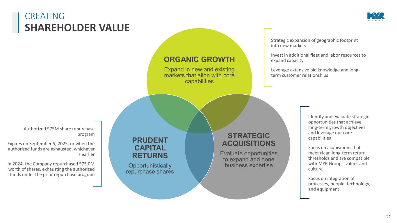20 EXECUTIVE LEADERSHIP Rick Swartz, CEO MYRG: 42 years Industry: 42 years 20 YEARS EXECUTIVES AVERAGE: WITH MYR GROUP Effective February 24, 2023 MYR Group Inc. has a strong team of experienced leaders that make up our executive team and Board of Directors. We believe diversity of our leadership is a critical component of creating long-term value for our shareholders. We select individuals that bring extensive experience and unique perspectives to both our Company and our Board. Kelly Huntington, CFO MYRG: 2 years Industry: 22 years Brian Stern, COO - T&D MYRG: 20 years Industry: 24 years Don Egan, COO - C&I MYRG: 33 years Industry: 33 years William Fry, CLO MYRG: 6 years Industry: 27 years 29 YEARS OF INDUSTRY EXPERIENCE 25% Female 88% Majority Independent 38% Racially/Ethnically/ Gender Diverse Directors BOARD OF DIRECTORS STATISTICS 7:1 Varied Tenure 7 of 8 have 0- 9 years 1 of 8 has 10+ years EXECUTIVES & BOARD OF DIRECTORS EXPERIENCED LEADERSHIP TEAM