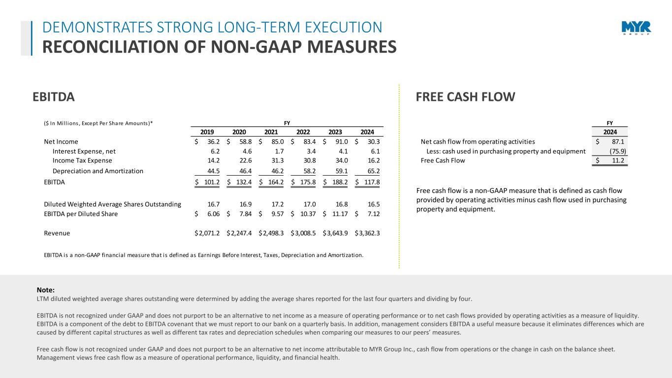 22 Note: LTM diluted weighted average shares outstanding were determined by adding the average shares reported for the last four quarters and dividing by four. EBITDA is not recognized under GAAP and does not purport to be an alternative to net income as a measure of operating performance or to net cash flows provided by operating activities as a measure of liquidity. EBITDA is a component of the debt to EBITDA covenant that we must report to our bank on a quarterly basis. In addition, management considers EBITDA a useful measure because it eliminates differences which are caused by different capital structures as well as different tax rates and depreciation schedules when comparing our measures to our peers’ measures. Free cash flow is not recognized under GAAP and does not purport to be an alternative to net income attributable to MYR Group Inc., cash flow from operations or the change in cash on the balance sheet. Management views free cash flow as a measure of operational performance, liquidity, and financial health. ($ In Mi l l ions , Except Per Share Amounts )* FY FY 2019 2020 2021 2022 2023 2024 2024 Net Income 36.2$ 58.8$ 85.0$ 83.4$ 91.0$ 30.3$ Net cash flow from operating activities 87.1$ Interest Expense, net 6.2 4.6 1.7 3.4 4.1 6.1 Less: cash used in purchasing property and equipment (75.9) Income Tax Expense 14.2 22.6 31.3 30.8 34.0 16.2 Free Cash Flow 11.2$ Depreciation and Amortization 44.5 46.4 46.2 58.2 59.1 65.2 EBITDA 101.2$ 132.4$ 164.2$ 175.8$ 188.2$ 117.8$ Diluted Weighted Average Shares Outstanding 16.7 16.9 17.2 17.0 16.8 16.5 EBITDA per Diluted Share 6.06$ 7.84$ 9.57$ 10.37$ 11.17$ 7.12$ Revenue 2,071.2$ 2,247.4$ 2,498.3$ 3,008.5$ 3,643.9$ 3,362.3$ EBITDA is a non-GAAP financial measure that is defined as Earnings Before Interest, Taxes, Depreciation and Amortization. Free cash flow is a non-GAAP measure that is defined as cash flow provided by operating activities minus cash flow used in purchasing property and equipment. EBITDA FREE CASH FLOW DEMONSTRATES STRONG LONG-TERM EXECUTION RECONCILIATION OF NON-GAAP MEASURES