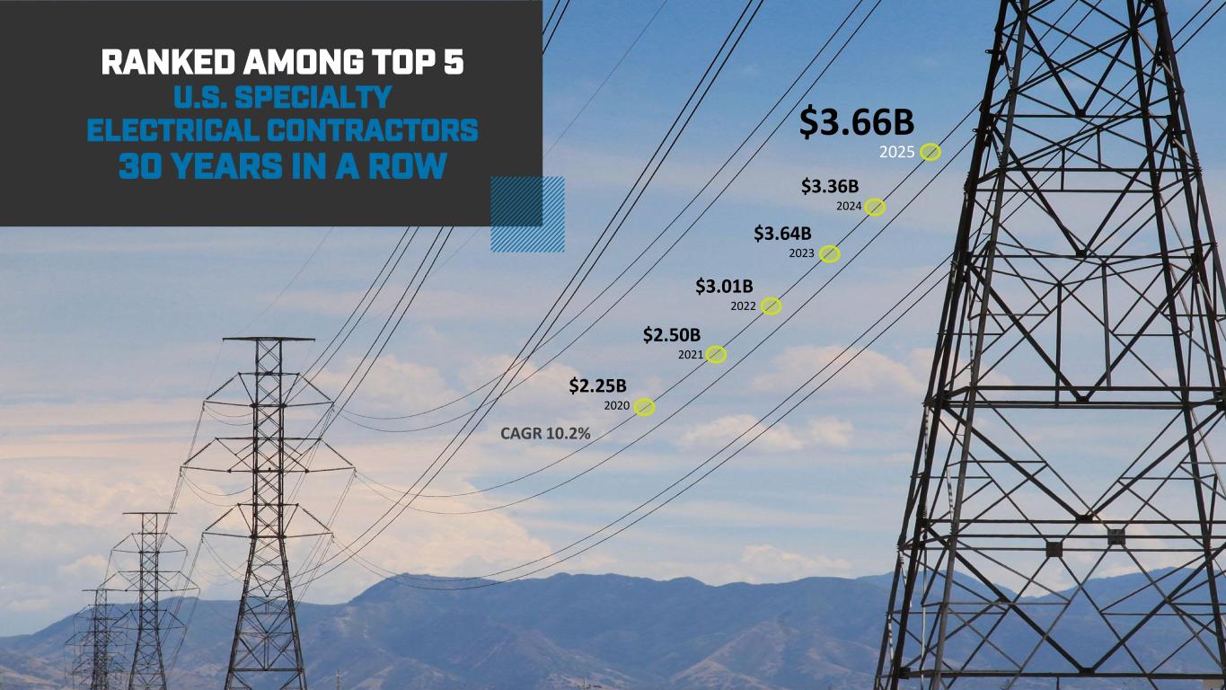 4 $3.66B 2025 $2.25B 2020 $2.50B 2021 $3.01B 2022 $3.36B 2024 RANKED AMONG TOP 5 U.S. SPECIALTY ELECTRICAL CONTRACTORS 30 YEARS IN A ROW $3.64B 2023 CAGR 10.2%