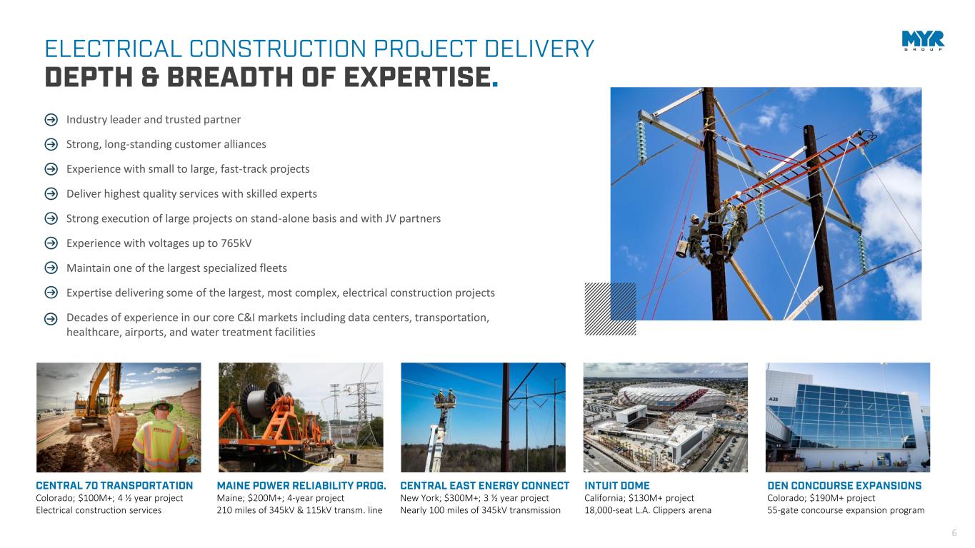 5 • T&D primarily consists of small to medium-sized projects, with some larger High Voltage Direct Current (HVDC) transmission projects. We execute routine maintenance work under long-term Master Service Agreements (MSAs). Strong, long-term drivers will continue to increase T&D spending. • The core markets we serve in C&I remain active, with multiple growth drivers and notable strength in data center and transportation opportunities. • Reshoring of manufacturing continues to create opportunities in our markets, and both MYR Group business segments are well positioned to benefit from this. • AI is driving growth in data centers and power demand. Data centers have been an important and growing end market for our C&I segment for a long time, while new interconnections, substations and infrastructure upgrades to data centers present additional opportunities for our T&D segment. • Strong balance sheet with $408M in availability under our $490M credit facility, and debt to LTM EBITDA leverage of 0.25x and $150M cash and equivalents, which management believes will enable us to meet our working capital needs, support organic growth, pursue acquisitions, and opportunistically repurchase shares. WHAT WE SEE OUTLOOK.