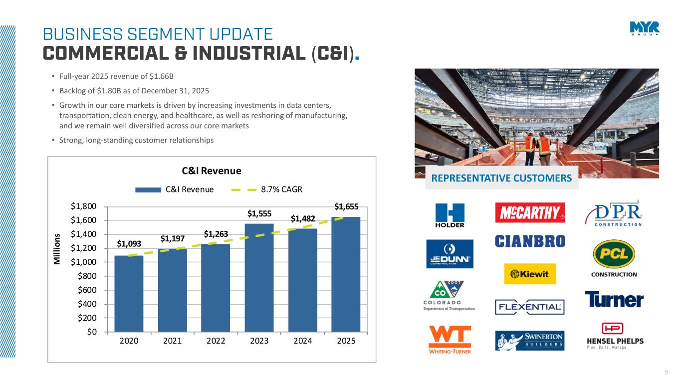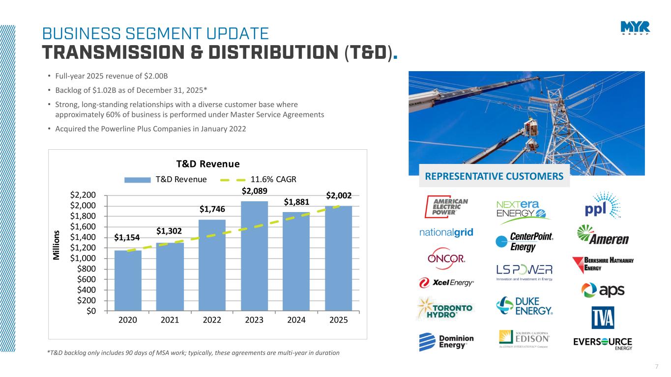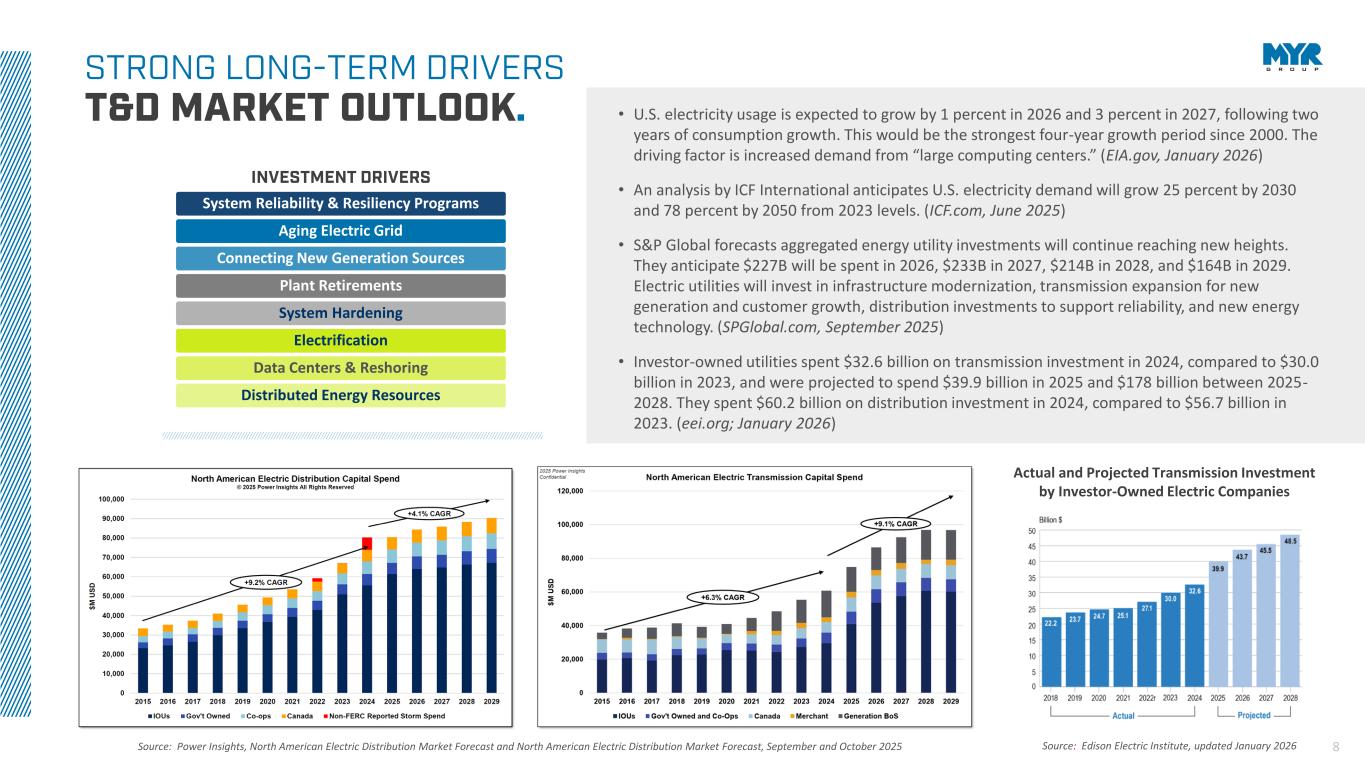 3 65+ OFFICE LOCATIONS MYR Group Inc. is a holding company of subsidiaries that has delivered some of the largest and most notable electrical infrastructure and commercial and industrial projects throughout the United States and Canada, since 1891. MYR GROUP INC. - A MARKET LEADER IN ELECTRICAL CONSTRUCTION. CONTINUED GROWTH Strong presence in key markets with healthy organic and acquisitive growth opportunities SUPERIOR SAFETY CULTURE Performance that exceeds industry standards; 2025 stats: TCIR – 0.92 LTIR - 0.14 STRONG FINANCIALS Strong balance sheet to support future growth and projects of any magnitude with proven execution of corporate strategy EXTENSIVE RESOURCES & EXPERTISE Dedicated workforce of 9,000+ employees, centralized operations for greater efficiency and cross-collaboration and one of the largest centralized, specialized fleets in the industry LONG-STANDING CUSTOMERS Established client relationships and alliance partnerships across the U.S. and Canada (some held for 50+ years), and more than 90% return clients in both segments ESSENTIAL CLEAN ENERGY CONTRACTOR Superior electrical services that support the clean energy transformation and growing electricity demand EXPERIENCED LEADERSHIP Executive team that averages more than 30 years of industry experience Reportable Segments: T&D and C&I HEALTHCARE TRANSPORTATION WATER/WASTEWATER DATA CENTERS CLEAN ENERGY WAREHOUSING COMMERCIAL & INDUSTRIAL (C&I) TRANSMISSION DISTRIBUTION SUBSTATION STREET LIGHTING STORM RESTORATION ENERGY STORAGE TRANSMISSION & DISTRIBUTION (T&D) INVESTMENT HIGHLIGHTS
