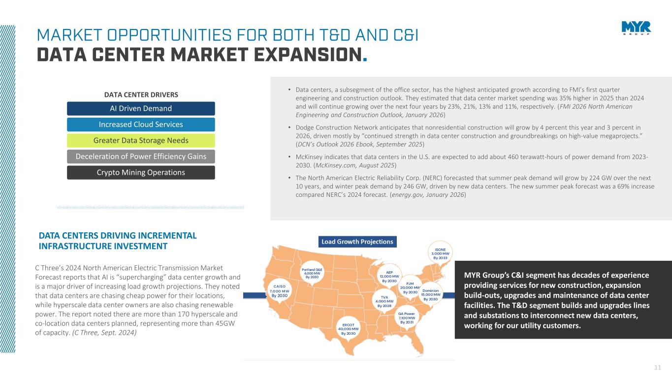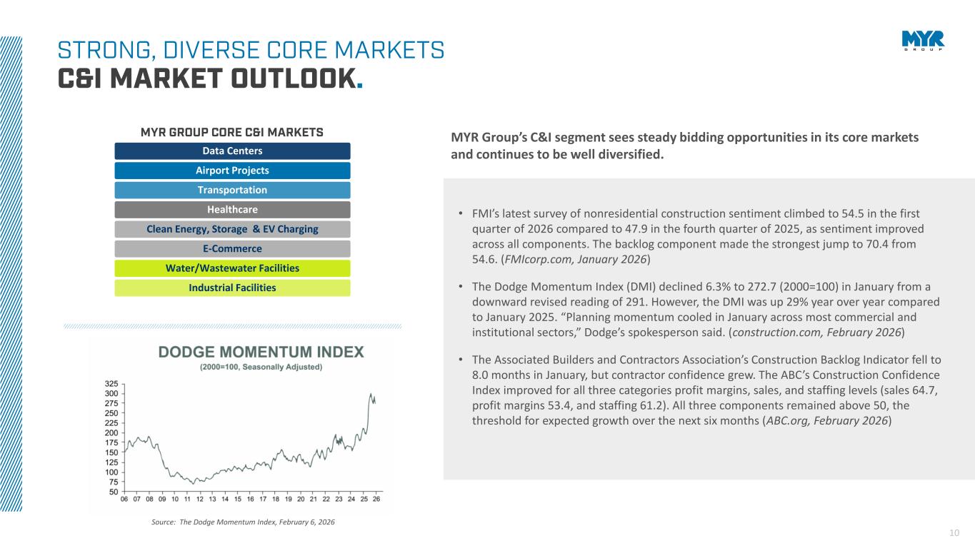 10 Data Centers Airport Projects Transportation Healthcare Clean Energy, Storage & EV Charging E-Commerce Water/Wastewater Facilities Industrial Facilities MYR GROUP CORE C&I MARKETS STRONG, DIVERSE CORE MARKETS C&I MARKET OUTLOOK. • FMI’s latest survey of nonresidential construction sentiment climbed to 54.5 in the first quarter of 2026 compared to 47.9 in the fourth quarter of 2025, as sentiment improved across all components. The backlog component made the strongest jump to 70.4 from 54.6. (FMIcorp.com, January 2026) • The Dodge Momentum Index (DMI) declined 6.3% to 272.7 (2000=100) in January from a downward revised reading of 291. However, the DMI was up 29% year over year compared to January 2025. “Planning momentum cooled in January across most commercial and institutional sectors,” Dodge’s spokesperson said. (construction.com, February 2026) • The Associated Builders and Contractors Association’s Construction Backlog Indicator fell to 8.0 months in January, but contractor confidence grew. The ABC’s Construction Confidence Index improved for all three categories profit margins, sales, and staffing levels (sales 64.7, profit margins 53.4, and staffing 61.2). All three components remained above 50, the threshold for expected growth over the next six months (ABC.org, February 2026) Source: The Dodge Momentum Index, February 6, 2026 MYR Group’s C&I segment sees steady bidding opportunities in its core markets and continues to be well diversified.