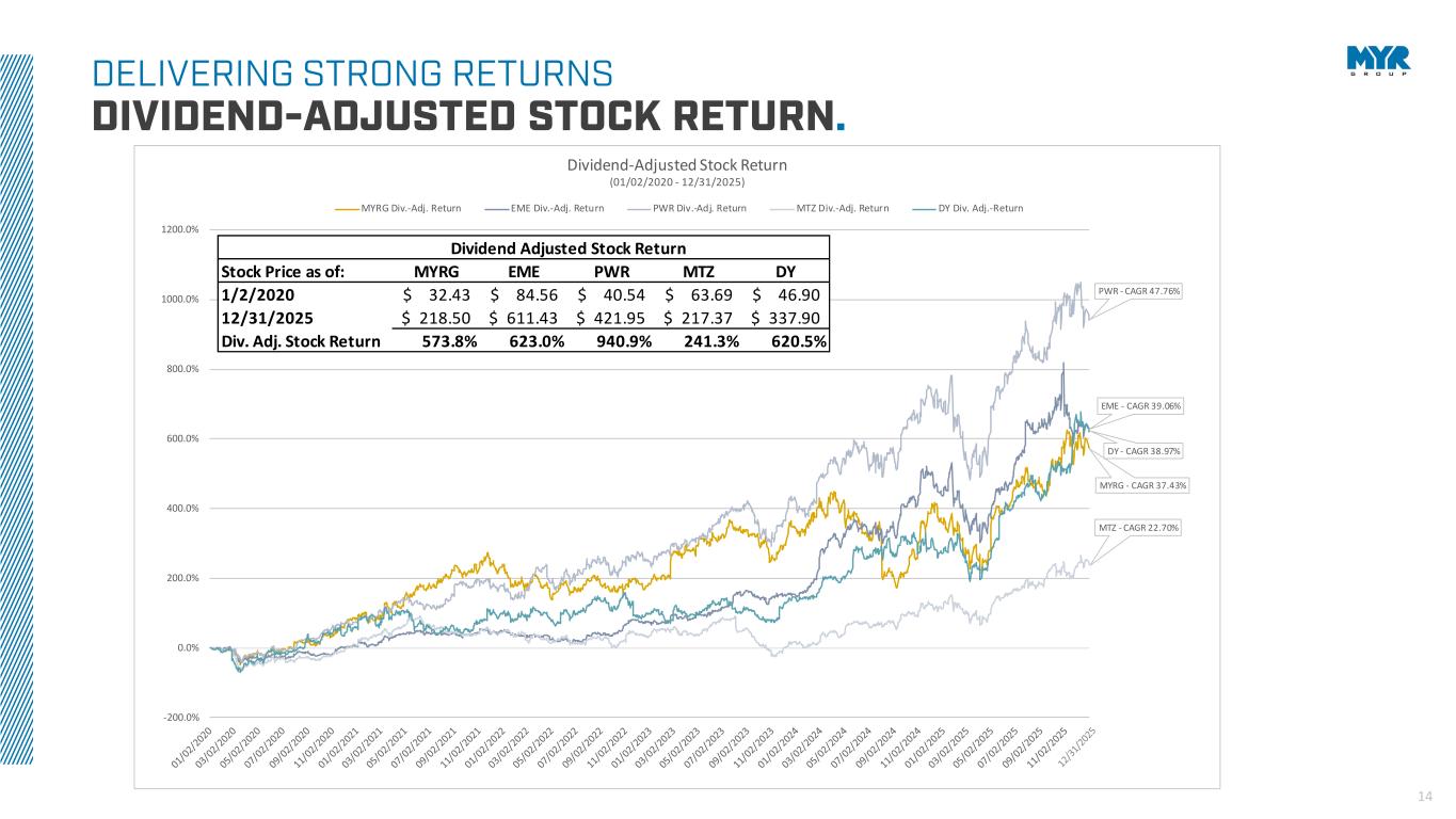 14 MYRG - CAGR 37.43% EME - CAGR 39.06% PWR - CAGR 47.76% MTZ - CAGR 22.70% DY - CAGR 38.97% -200.0% 0.0% 200.0% 400.0% 600.0% 800.0% 1000.0% 1200.0% Dividend-Adjusted Stock Return (01/02/2020 - 12/31/2025) MYRG Div.-Adj. Return EME Div.-Adj. Return PWR Div.-Adj. Return MTZ Div.-Adj. Return DY Div. Adj.-Return DELIVERING STRONG RETURNS DIVIDEND-ADJUSTED STOCK RETURN. Dividend Adjusted Stock Return Stock Price as of: MYRG EME PWR MTZ DY 1/2/2020 32.43$ 84.56$ 40.54$ 63.69$ 46.90$ 12/31/2025 218.50$ 611.43$ 421.95$ 217.37$ 337.90$ Div. Adj. Stock Return 573.8% 623.0% 940.9% 241.3% 620.5%