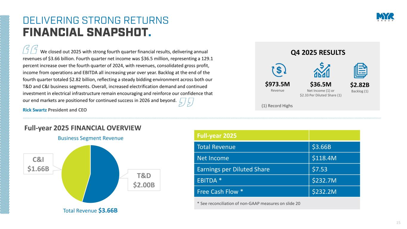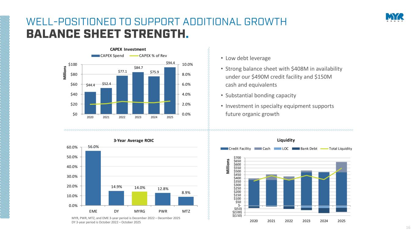 15 Q4 2025 RESULTS $36.5M Net Income (1) or $2.33 Per Diluted Share (1) $2.82B Backlog (1) $973.5M Revenue We closed out 2025 with strong fourth quarter financial results, delivering annual revenues of $3.66 billion. Fourth quarter net income was $36.5 million, representing a 129.1 percent increase over the fourth quarter of 2024, with revenues, consolidated gross profit, income from operations and EBITDA all increasing year over year. Backlog at the end of the fourth quarter totaled $2.82 billion, reflecting a steady bidding environment across both our T&D and C&I business segments. Overall, increased electrification demand and continued investment in electrical infrastructure remain encouraging and reinforce our confidence that our end markets are positioned for continued success in 2026 and beyond. Rick Swartz President and CEO DELIVERING STRONG RETURNS FINANCIAL SNAPSHOT. T&D $2.00B C&I $1.66B Business Segment Revenue Full-year 2025 Total Revenue $3.66B Net Income $118.4M Earnings per Diluted Share $7.53 EBITDA * $232.7M Free Cash Flow * $232.2M * See reconciliation of non-GAAP measures on slide 20 Full-year 2025 FINANCIAL OVERVIEW Total Revenue $3.66B (1) Record Highs