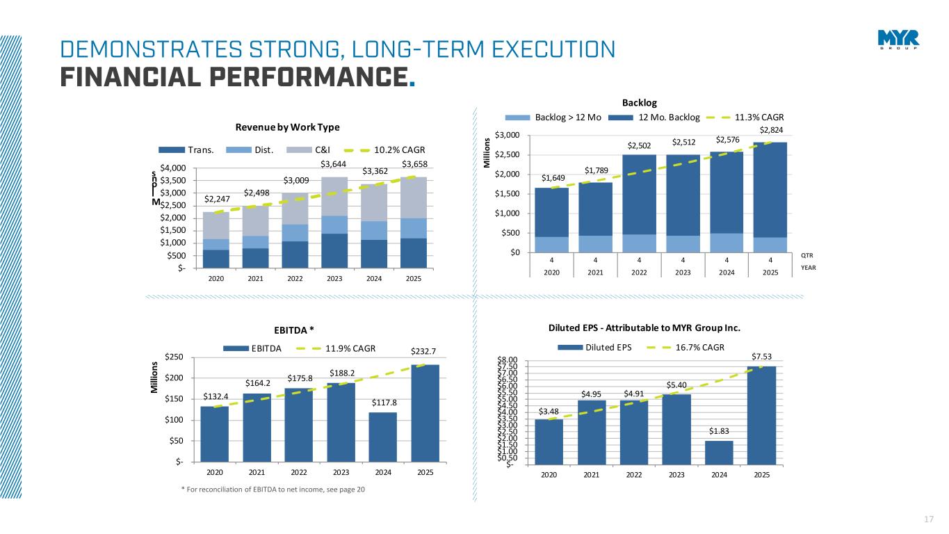 16 56.0% 14.9% 14.0% 12.8% 8.9% 0.0% 10.0% 20.0% 30.0% 40.0% 50.0% 60.0% EME DY MYRG PWR MTZ 3-Year Average ROIC WELL-POSITIONED TO SUPPORT ADDITIONAL GROWTH BALANCE SHEET STRENGTH. MYR, PWR, MTZ, and EME 3-year period is December 2022 – December 2025 DY 3-year period is October 2022 – October 2025 • Low debt leverage • Strong balance sheet with $408M in availability under our $490M credit facility and $150M cash and equivalents • Substantial bonding capacity • Investment in specialty equipment supports future organic growth $44.4 $52.4 $77.1 $84.7 $75.9 $94.4 0.0% 2.0% 4.0% 6.0% 8.0% 10.0% $0 $20 $40 $60 $80 $100 2020 2021 2022 2023 2024 2025 M ill io n s CAPEX Investment CAPEX Spend CAPEX % of Rev $(150) $(100) $(50) $- $50 $100 $150 $200 $250 $300 $350 $400 $450 $500 $550 $600 $650 $700 2020 2021 2022 2023 2024 2025 M il li o n s Liquidity Credit Facility Cash LOC Bank Debt Total Liquidity