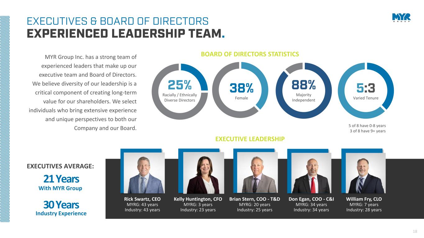 17 $132.4 $164.2 $175.8 $188.2 $117.8 $232.7 $- $50 $100 $150 $200 $250 2020 2021 2022 2023 2024 2025 M ill io n s EBITDA * EBITDA 11.9% CAGR DEMONSTRATES STRONG, LONG-TERM EXECUTION FINANCIAL PERFORMANCE. * For reconciliation of EBITDA to net income, see page 20 QTR YEAR $2,247 $2,498 $3,009 $3,644 $3,362 $3,658 $- $500 $1,000 $1,500 $2,000 $2,500 $3,000 $3,500 $4,000 2020 2021 2022 2023 2024 2025 M ill io n s Revenue by Work Type Trans. Dist. C&I 10.2% CAGR $1,649 $1,789 $2,502 $2,512 $2,576 $2,824 $0 $500 $1,000 $1,500 $2,000 $2,500 $3,000 4 4 4 4 4 4 2020 2021 2022 2023 2024 2025 M il li o n s Backlog Backlog > 12 Mo 12 Mo. Backlog 11.3% CAGR $3.48 $4.95 $4.91 $5.40 $1.83 $7.53 $- $0.50 $1.00 $1.50 $2.00 $2.50 $3.00 $3.50 $4.00 $4.50 $5.00 $5.50 $6.00 $6.50 $7.00 $7.50 $8.00 2020 2021 2022 2023 2024 2025 Diluted EPS - Attributable to MYR Group Inc. Diluted EPS 16.7% CAGR