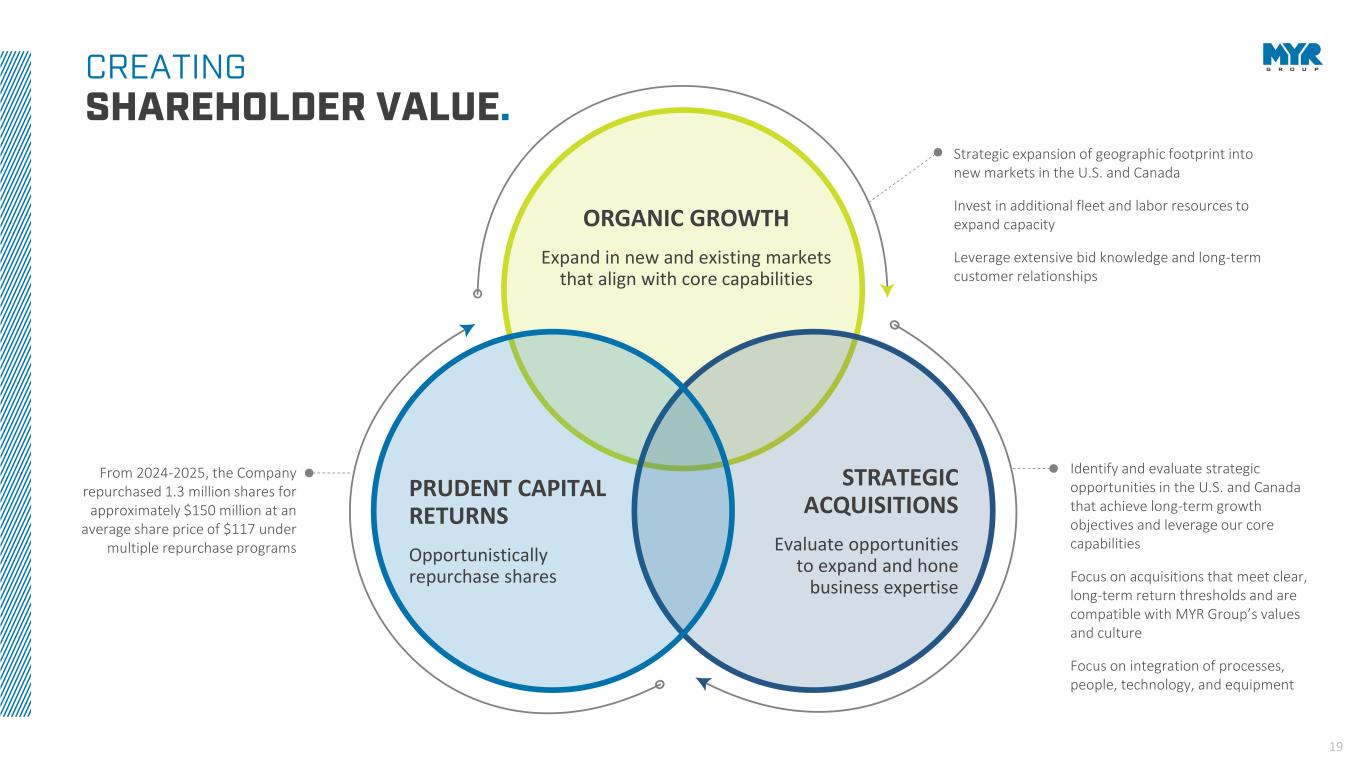 18 EXECUTIVE LEADERSHIP Rick Swartz, CEO MYRG: 43 years Industry: 43 years 21 Years EXECUTIVES AVERAGE: With MYR Group MYR Group Inc. has a strong team of experienced leaders that make up our executive team and Board of Directors. We believe diversity of our leadership is a critical component of creating long-term value for our shareholders. We select individuals who bring extensive experience and unique perspectives to both our Company and our Board. Kelly Huntington, CFO MYRG: 3 years Industry: 23 years Brian Stern, COO - T&D MYRG: 20 years Industry: 25 years Don Egan, COO - C&I MYRG: 34 years Industry: 34 years William Fry, CLO MYRG: 7 years Industry: 28 years 30 Years Industry Experience 38% Female 88% Majority Independent 25% Racially / Ethnically Diverse Directors BOARD OF DIRECTORS STATISTICS 5:3 Varied Tenure 5 of 8 have 0-8 years 3 of 8 have 9+ years EXECUTIVES & BOARD OF DIRECTORS EXPERIENCED LEADERSHIP TEAM.