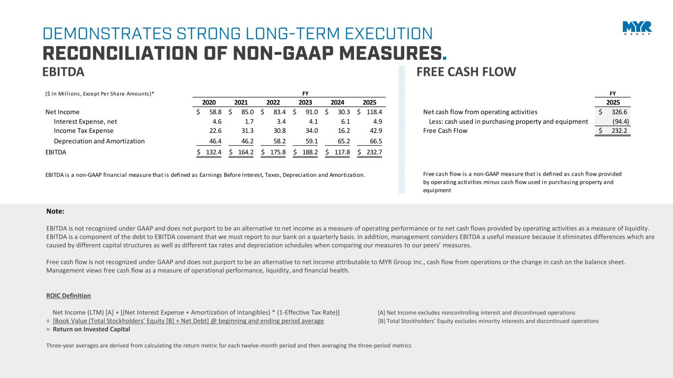 20 Note: EBITDA is not recognized under GAAP and does not purport to be an alternative to net income as a measure of operating performance or to net cash flows provided by operating activities as a measure of liquidity. EBITDA is a component of the debt to EBITDA covenant that we must report to our bank on a quarterly basis. In addition, management considers EBITDA a useful measure because it eliminates differences which are caused by different capital structures as well as different tax rates and depreciation schedules when comparing our measures to our peers’ measures. Free cash flow is not recognized under GAAP and does not purport to be an alternative to net income attributable to MYR Group Inc., cash flow from operations or the change in cash on the balance sheet. Management views free cash flow as a measure of operational performance, liquidity, and financial health. ROIC Definition Net Income (LTM) [A] + [(Net Interest Expense + Amortization of Intangibles) * (1-Effective Tax Rate)] [A] Net Income excludes noncontrolling interest and discontinued operations ÷ [Book Value (Total Stockholders’ Equity [B] + Net Debt] @ beginning and ending period average [B] Total Stockholders’ Equity excludes minority interests and discontinued operations = Return on Invested Capital Three-year averages are derived from calculating the return metric for each twelve-month period and then averaging the three-period metrics EBITDA FREE CASH FLOW DEMONSTRATES STRONG LONG-TERM EXECUTION RECONCILIATION OF NON-GAAP MEASURES. ($ In Mi l l ions , Except Per Share Amounts)* FY FY 2020 2021 2022 2023 2024 2025 2025 Net Income 58.8$ 85.0$ 83.4$ 91.0$ 30.3$ 118.4$ Net cash flow from operating activities 326.6$ Interest Expense, net 4.6 1.7 3.4 4.1 6.1 4.9 Less: cash used in purchasing property and equipment (94.4) Income Tax Expense 22.6 31.3 30.8 34.0 16.2 42.9 Free Cash Flow 232.2$ Depreciation and Amortization 46.4 46.2 58.2 59.1 65.2 66.5 EBITDA 132.4$ 164.2$ 175.8$ 188.2$ 117.8$ 232.7$ EBITDA is a non-GAAP financial measure that is defined as Earnings Before Interest, Taxes, Depreciation and Amortization. Free cash flow is a non-GAAP measure that is defined as cash flow provided by operating activities minus cash flow used in purchasing property and equipment