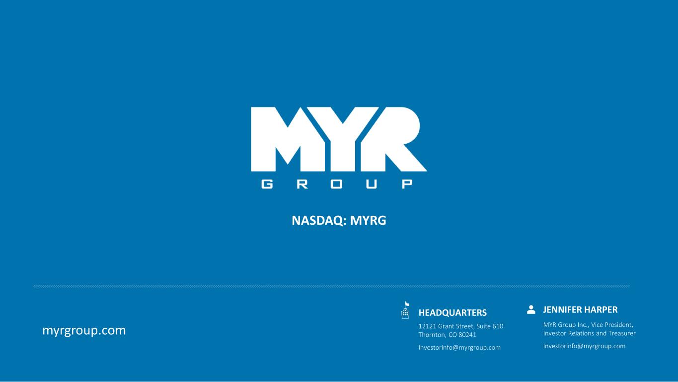 21 JENNIFER HARPER MYR Group Inc., Vice President, Investor Relations and Treasurer Investorinfo@myrgroup.com NASDAQ: MYRG 12121 Grant Street, Suite 610 Thornton, CO 80241 Investorinfo@myrgroup.com HEADQUARTERS myrgroup.com