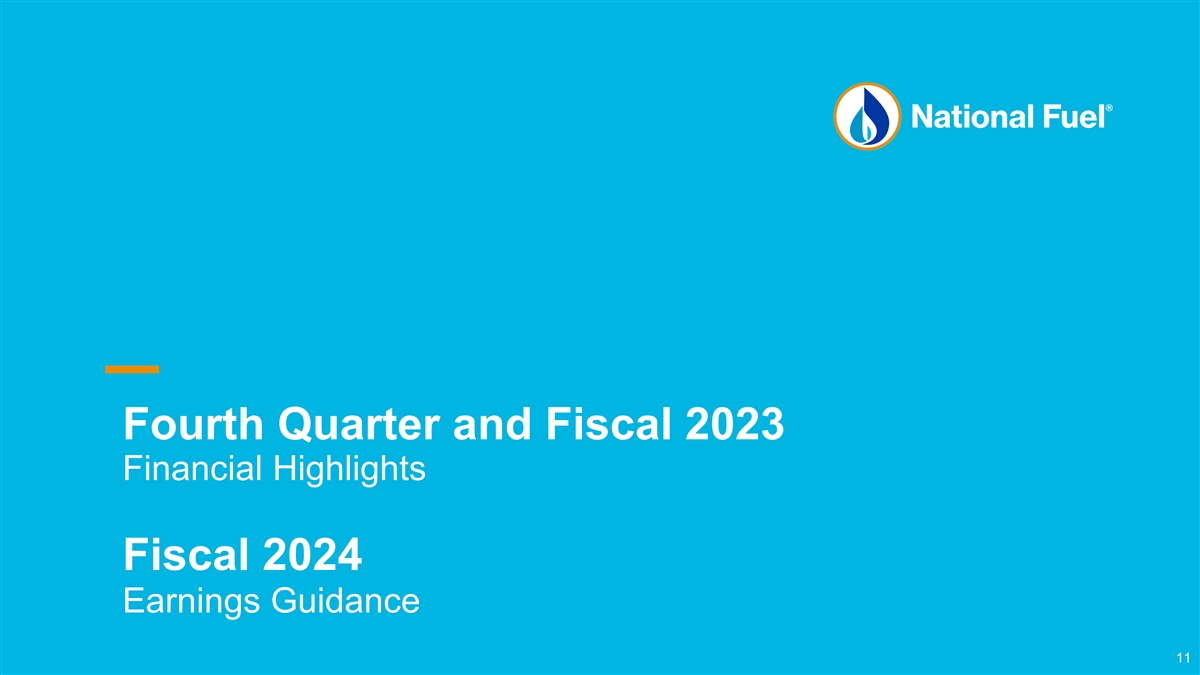 Emissions Reduction Targets and Initiatives Significant Methane Intensity and Greenhouse Progress Gas Emissions Reduction Targets Across the Ongoing Sustainability Initiatives (2) Since 2020 (1) Energy Value Chain ü Responsible Gas Certifications Exploration & 40% Reduction in Methane Intensity by 2030 27.4% Productionü Pneumatic Device Replacement ü Equipment upgrades at Existing Facilities Gathering 30% Reduction in Methane Intensity by 2030 ü Use of Best-in-Class Emissions Controls for 14.3% New Facilities ü Equipment upgrades at Existing Facilities 50% Reduction in Methane Intensity by 2030 18.2% Pipeline & Storage ü Use of Best-in-Class Emissions Controls for New Facilities ü Investment in System Modernization vü Advancing RNG in Service Territory 30% Reduction in Methane Intensity by 2030 Utility 8.3% ü Hydrogen Blending Demonstration Projects (3) +1% ü ONE Future v 25% Reduction in GHG Emissions by 2030 54% production growth NFG ü EPA Methane Challenge 8% throughput growth (1) All emissions reduction targets based on 2020 baseline. (2) Measured using Calendar 2022 emissions data, as reported in Company’s 2022 Corporate Responsibility Report. 10 (3) Total GHG emissions largely flat vs. 2020 despite significant production and throughput growth. Total methane emissions decreased by ~7%.