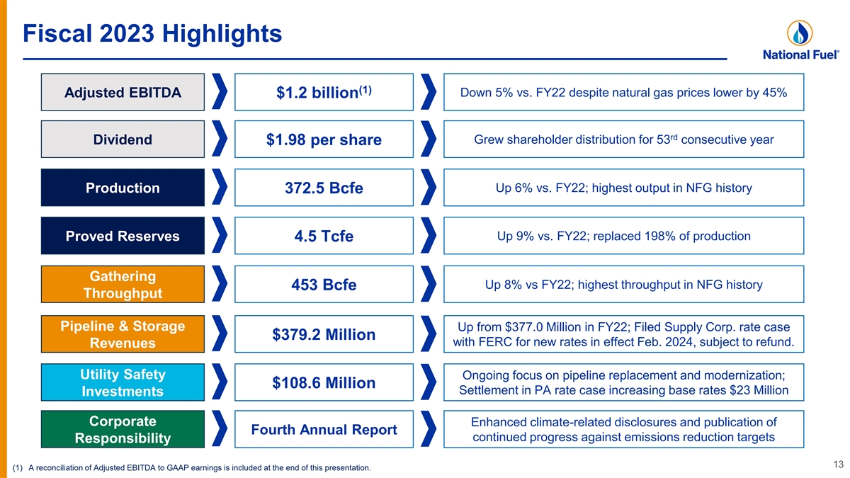 Fourth Quarter Fiscal 2023 Results and Drivers (1) Adjusted Operating Results ($/share) Q4 FY 2022 Q4 FY 2023 Major Drivers $1.19 $2.84 Natural Gas Prices $2.33 Exploration & $0.78 $0.95 Production $0.81 Exploration & Production Natural Gas Production / $0.38 93.7 87.9 Gathering Throughput Gathering Gathering $0.25 $0.29 Pipeline & Storage Pipeline & Storage $0.27 $0.25 $0.98 $0.94 Increased Scale Utility: ($0.12) Utility: ($0.08) Corporate/Other: ($0.02) Corporate/Other: ($0.06) Q4 FY22 Q4 FY23 (1) A Reconciliation of Adjusted Operating Results to Earnings Per Share is provided at the end of this presentation. 12 (2) Realized price after hedging. E&P Cash Operating Net Gas Production Natural Gas Pricing (2) Costs ($/Mcfe) (Bcf) ($/Mcfe)