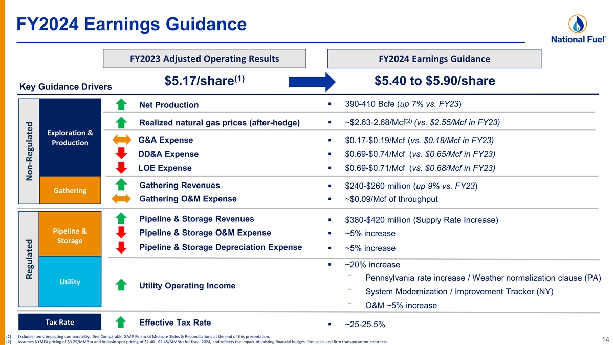 Fiscal 2023 Highlights (1) Down 5% vs. FY22 despite natural gas prices lower by 45% Adjusted EBITDA $1.2 billion rd Dividend Grew shareholder distribution for 53 consecutive year $1.98 per share Up 6% vs. FY22; highest output in NFG history Production 372.5 Bcfe Proved Reserves Up 9% vs. FY22; replaced 198% of production 4.5 Tcfe Gathering Up 8% vs FY22; highest throughput in NFG history 453 Bcfe Throughput Pipeline & Storage Up from $377.0 Million in FY22; Filed Supply Corp. rate case $379.2 Million with FERC for new rates in effect Feb. 2024, subject to refund. Revenues Utility Safety Ongoing focus on pipeline replacement and modernization; $108.6 Million Settlement in PA rate case increasing base rates $23 Million Investments Corporate Enhanced climate-related disclosures and publication of Fourth Annual Report continued progress against emissions reduction targets Responsibility 13 (1) A reconciliation of Adjusted EBITDA to GAAP earnings is included at the end of this presentation.