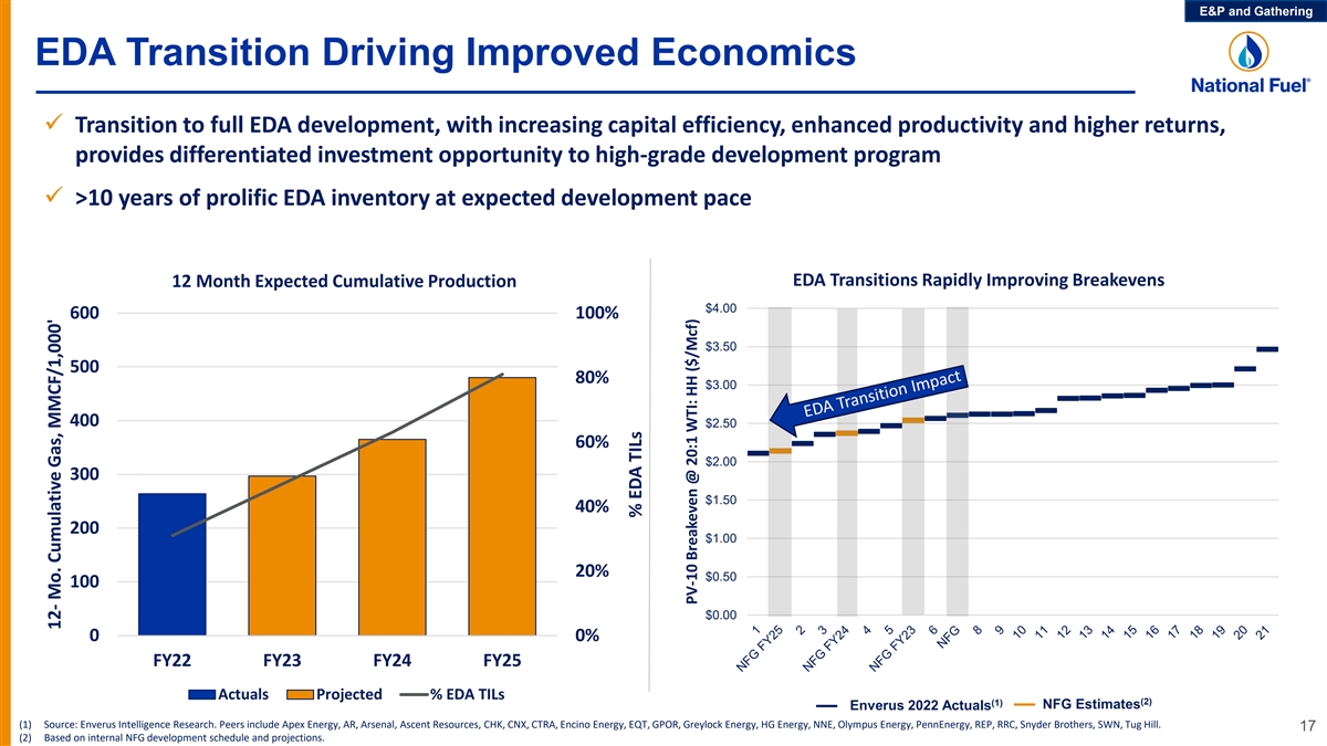 E&P and Gathering Focus on Capital Efficiency (1) Net Production (Bcfe) Capital Expenditures ($ MM) $600 400 300 $400 390- $525 - $588 200 $566 372.5 352.5 410 $575 $200 100 0 $0 2022 2023 2024E 2022 2023 2024E Near-Term Strategy ü Continue to moderate activity level to target maintenance-to-low production growth beyond fiscal 2024 § Commenced transition to focus majority of the development program in the EDA to maximize long-term returns and capital efficiency ü EDA Tioga: development focused primarily on Utica (modest Marcellus activity) ü EDA Lycoming: activity maintains production level that fully utilizes valuable Atlantic Sunrise capacity ü WDA: limited development focused on Utica Shale, with return trips in Clermont-Rich Valley area 16 (1) A reconciliation to Capital Expenditures as presented on the Consolidated Statement of Cash Flows is included at the end of this presentation. FY23 reflects the netting of $150 million related to acquisition of upstream assets and acreage in 2H FY23.