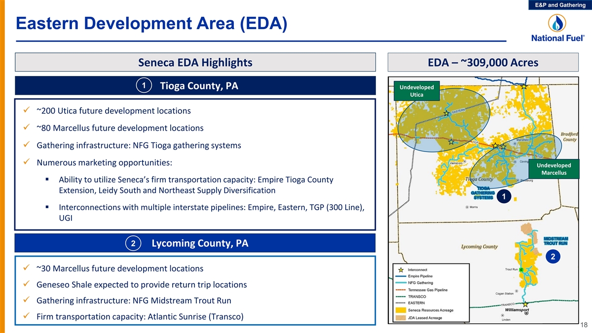 E&P and Gathering EDA Transition Driving Improved Economics ü Transition to full EDA development, with increasing capital efficiency, enhanced productivity and higher returns, provides differentiated investment opportunity to high-grade development program ü >10 years of prolific EDA inventory at expected development pace EDA Transitions Rapidly Improving Breakevens 12 Month Expected Cumulative Production $4.00 600 100% $3.50 500 80% $3.00 400 $2.50 60% $2.00 300 $1.50 40% 200 $1.00 20% $0.50 100 $0.00 0 0% FY22 FY23 FY24 FY25 Actuals Projected % EDA TILs (2) (1) NFG Estimates Enverus 2022 Actuals (1) Source: Enverus Intelligence Research. Peers include Apex Energy, AR, Arsenal, Ascent Resources, CHK, CNX, CTRA, Encino Energy, EQT, GPOR, Greylock Energy, HG Energy, NNE, Olympus Energy, PennEnergy, REP, RRC, Snyder Brothers, SWN, Tug Hill. 17 (2) Based on internal NFG development schedule and projections. 12- Mo. Cumulative Gas, MMCF/1,000' % EDA TILs PV-10 Breakeven @ 20:1 WTI: HH ($/Mcf)