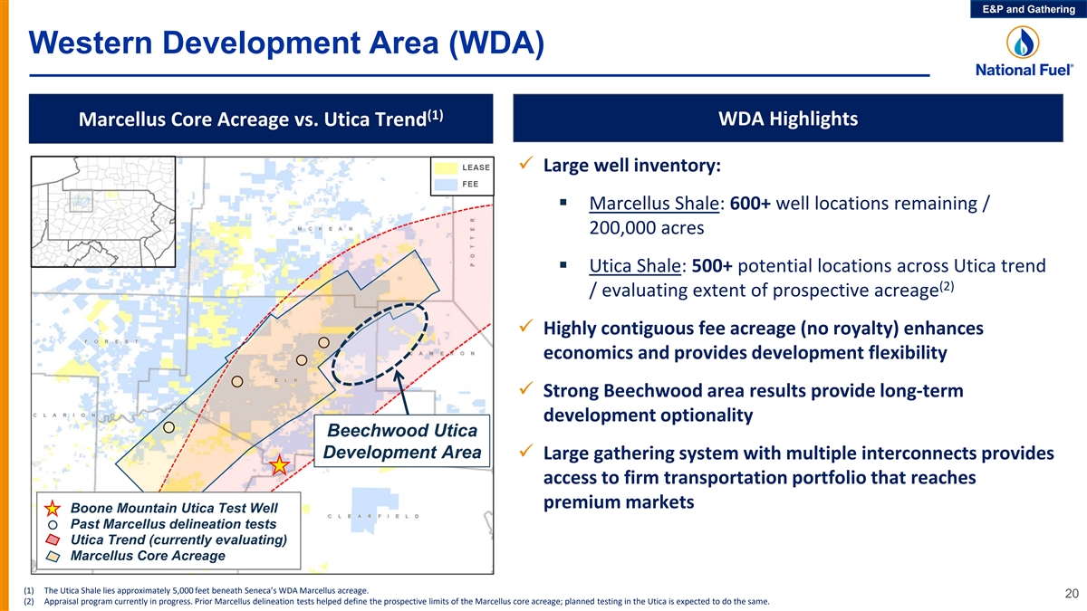 E&P and Gathering Eastern Development Area (EDA) Seneca EDA Highlights EDA – ~309,000 Acres 1 Tioga County, PA Undeveloped Utica ü ~200 Utica future development locations ü ~80 Marcellus future development locations ü Gathering infrastructure: NFG Tioga gathering systems ü Numerous marketing opportunities: Undeveloped Marcellus § Ability to utilize Seneca’s firm transportation capacity: Empire Tioga County Extension, Leidy South and Northeast Supply Diversification 1 § Interconnections with multiple interstate pipelines: Empire, Eastern, TGP (300 Line), UGI 2 Lycoming County, PA 2 ü ~30 Marcellus future development locations ü Geneseo Shale expected to provide return trip locations ü Gathering infrastructure: NFG Midstream Trout Run ü Firm transportation capacity: Atlantic Sunrise (Transco) 18