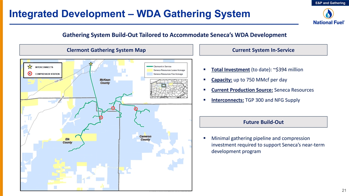 E&P and Gathering Western Development Area (WDA) (1) Marcellus Core Acreage vs. Utica Trend WDA Highlights ü Large well inventory: § Marcellus Shale: 600+ well locations remaining / 200,000 acres § Utica Shale: 500+ potential locations across Utica trend (2) / evaluating extent of prospective acreage ü Highly contiguous fee acreage (no royalty) enhances economics and provides development flexibility ü Strong Beechwood area results provide long-term development optionality Beechwood Utica Development Area ü Large gathering system with multiple interconnects provides access to firm transportation portfolio that reaches premium markets Boone Mountain Utica Test Well Past Marcellus delineation tests Utica Trend (currently evaluating) ? Marcellus Core Acreage (1) The Utica Shale lies approximately 5,000 feet beneath Seneca’s WDA Marcellus acreage. 20 (2) Appraisal program currently in progress. Prior Marcellus delineation tests helped define the prospective limits of the Marcellus core acreage; planned testing in the Utica is expected to do the same.