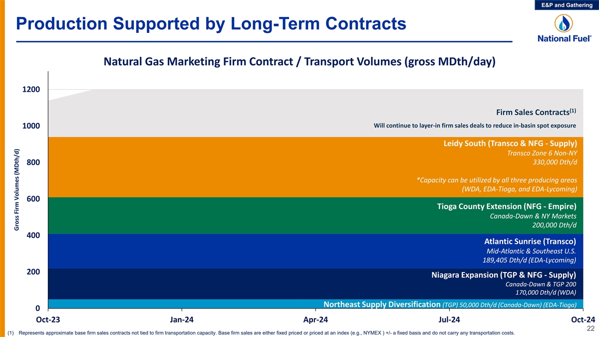 E&P and Gathering Integrated Development – WDA Gathering System Gathering System Build-Out Tailored to Accommodate Seneca’s WDA Development Clermont Gathering System Map Current System In-Service § Total Investment (to date): ~$394 million § Capacity: up to 750 MMcf per day § Current Production Source: Seneca Resources § Interconnects: TGP 300 and NFG Supply Future Build-Out § Minimal gathering pipeline and compression investment required to support Seneca’s near-term development program 21