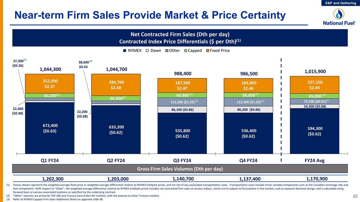 E&P and Gathering Production Supported by Long-Term Contracts Natural Gas Marketing Firm Contract / Transport Volumes (gross MDth/day) 1200 (1) Firm Sales Contracts Will continue to layer-in firm sales deals to reduce in-basin spot exposure 1000 Leidy South (Transco & NFG - Supply) Transco Zone 6 Non-NY 330,000 Dth/d 800 *Capacity can be utilized by all three producing areas (WDA, EDA-Tioga, and EDA-Lycoming) 600 Tioga County Extension (NFG - Empire) Canada-Dawn & NY Markets 200,000 Dth/d 400 Atlantic Sunrise (Transco) Mid-Atlantic & Southeast U.S. 189,405 Dth/d (EDA-Lycoming) 200 Niagara Expansion (TGP & NFG - Supply) Canada-Dawn & TGP 200 170,000 Dth/d (WDA) Northeast Supply Diversification (TGP) 50,000 Dth/d (Canada-Dawn) (EDA-Tioga) 0 Oct-23 Jan-24 Apr-24 Jul-24 Oct-24 22 (1) Represents approximate base firm sales contracts not tied to firm transportation capacity. Base firm sales are either fixed priced or priced at an index (e.g., NYMEX ) +/- a fixed basis and do not carry any transportation costs. Gross Firm Volumes (MDth/d)