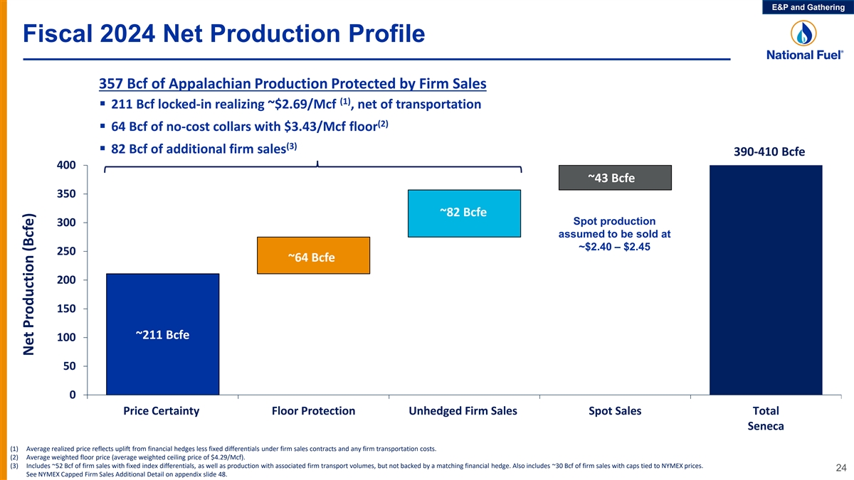 E&P and Gathering Near-term Firm Sales Provide Market & Price Certainty Net Contracted Firm Sales (Dth per day) (1) Contracted Index Price Differentials ($ per Dth) NYMEX Dawn Other Capped Fixed Price (2) (2) 37,300 38,600 ($0.26) $0.43 1,044,300 1,044,700 1,015,900 988,400 986,500 252,000 284,700 227,100 187,500 184,800 $2.37 $2.48 $2.44 $2.47 $2.46 (3) (3) (3) (3) (3) 66,800 66,800 60,200 65,000 (3) 66,000 (2) (2) (2) 75,200 ($0.91) 112,200 ($1.25) 112,300 ($1.25) 54,300 ($0.88) 22,400 86,200 ($0.86) 86,100 ($0.86) 22,200 ($0.98) ($0.88) 672,400 633,200 594,300 535,800 536,400 ($0.63) ($0.62) ($0.62) ($0.62) ($0.62) Q1 FY24 Q2 FY24 Q3 FY24 Q4 FY24 FY24 Avg Gross Firm Sales Volumes (Dth per day) 1,140,700 1,170,900 1,202,300 1,203,000 1,137,400 (1) Values shown represent the weighted average fixed price or weighted average differential relative to NYMEX (netback price), and are net of any associated transportation costs. Transportation costs include minor variable components such as the Canadian exchange rate and fuel components. With respect to “Other”, the weighted average differential relative to NYMEX (netback price) includes net contracted firm sales at various indices, which are to subject to fluctuations in the market, such as seasonal demand swings, and is calculated using forward basis at various associated locations as specified by the underlying contract. (2) “Other” volumes are primarily TGP 200 and Transco Zone 6 Non-NY markets, with the balance to other Transco markets. 23 (3) Refer to NYMEX Capped Firm Sales Additional Detail on appendix slide 48.