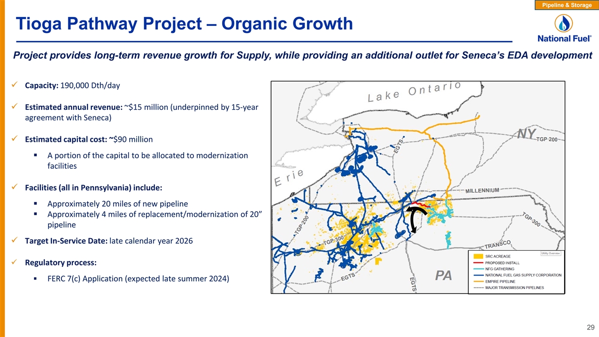 Pipeline & Storage Pipeline & Storage Segment Overview National Fuel Gas Supply Corporation (1) ü Contracted Capacity : § Firm Transportation: 3,461 MDth per day § Firm Storage: 70,693 MDth (fully subscribed) (2) ü Rate Base : ~$1,179 million Empire Pipeline ü FERC Rate Proceeding Status: § Filed rate case on July 31, 2023 § New rates expected to go into effect (subject to refund) on Supply Corp. February 1, 2024 Empire Pipeline, Inc. (1) ü Contracted Capacity : § Firm Transportation: 964 MDth per day § Firm Storage: 3,753 MDth (fully subscribed) (2) ü Rate Base : ~$328 million ü FERC Rate Proceeding Status: § Rates in effect since January 2019 § Must file for new rates no later than May 31, 2025 (1) As of September 30, 2022 as disclosed in the Company’s fiscal 2022 Form 10-K. 28 (2) As of December 31, 2022 calculated from National Fuel Gas Supply Corporation’s and Empire Pipeline, Inc.’s 2022 FERC Form-2 reports, respectively.