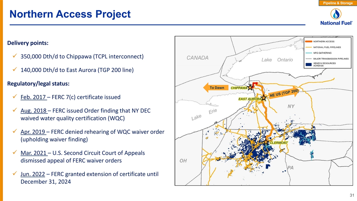 Pipeline & Storage Northern Access Project Delivery points: ü 350,000 Dth/d to Chippawa (TCPL interconnect) ü 140,000 Dth/d to East Aurora (TGP 200 line) Regulatory/legal status: To Dawn ü Feb. 2017 – FERC 7(c) certificate issued ü Aug. 2018 – FERC issued Order finding that NY DEC waived water quality certification (WQC) ü Apr. 2019 – FERC denied rehearing of WQC waiver order (upholding waiver finding) ü Mar. 2021 – U.S. Second Circuit Court of Appeals dismissed appeal of FERC waiver orders ü Jun. 2022 – FERC granted extension of certificate until December 31, 2024 31