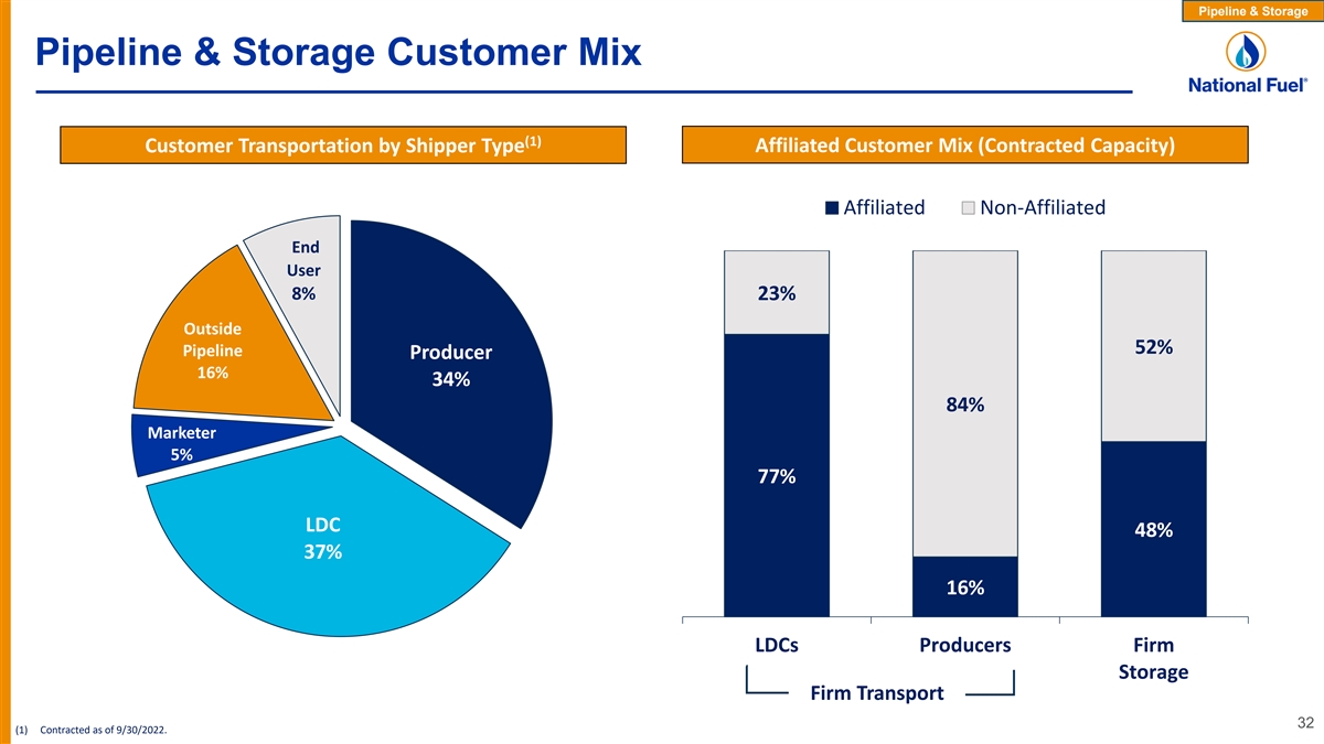Pipeline & Storage Pipeline & Storage Customer Mix (1) Customer Transportation by Shipper Type Affiliated Customer Mix (Contracted Capacity) Affiliated Non-Affiliated End User 8% 23% Outside 52% Pipeline Producer 16% 34% 84% Marketer 5% 77% LDC 48% 37% 16% LDCs Producers Firm Storage Firm Transport 32 (1) Contracted as of 9/30/2022.