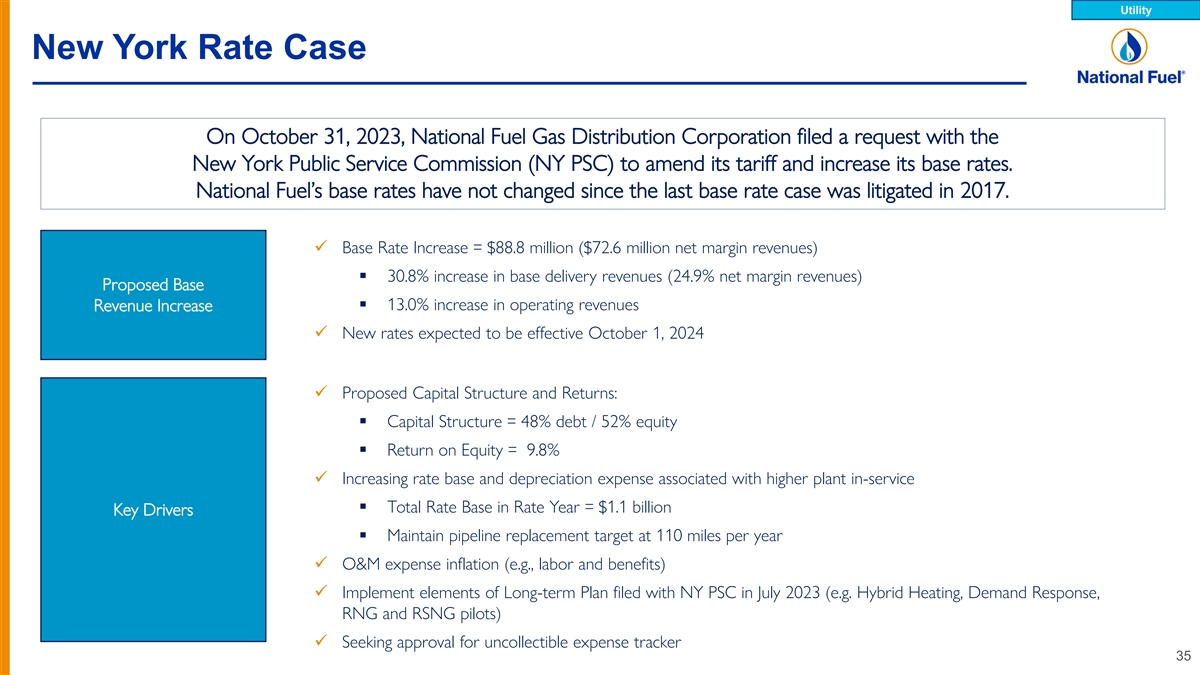 Utility New York & Pennsylvania Service Territories New York (1) Total Customers : 540,000 Allowed ROE: 8.7% (NY PSC Rate Case Order, April 2017) Rate Mechanisms: o Revenue Decoupling o Weather Normalization o Low Income Rates o Merchant Function Charge (Uncollectibles Adj.) o 90/10 Sharing (Large Customers) (2) o System Modernization / Improvement Trackers Pennsylvania (1) Total Customers : 214,000 Allowed ROE: Black Box Settlement (2023) - $23 MM rate increase Rate Mechanisms: o Weather Normalization (added August 1, 2023) o Low Income Rates o Merchant Function Charge o Distribution System Improvement Charge (DSIC) – eligible (3) August 1, 2024 (1) As of September 30, 2022. (2) Applied to new plant placed in service through September 30, 2024. 34 (3) Eligible to recover costs on incremental system investments after August 1, 2024, subject to attaining rate year plant balance of $781.3 million.