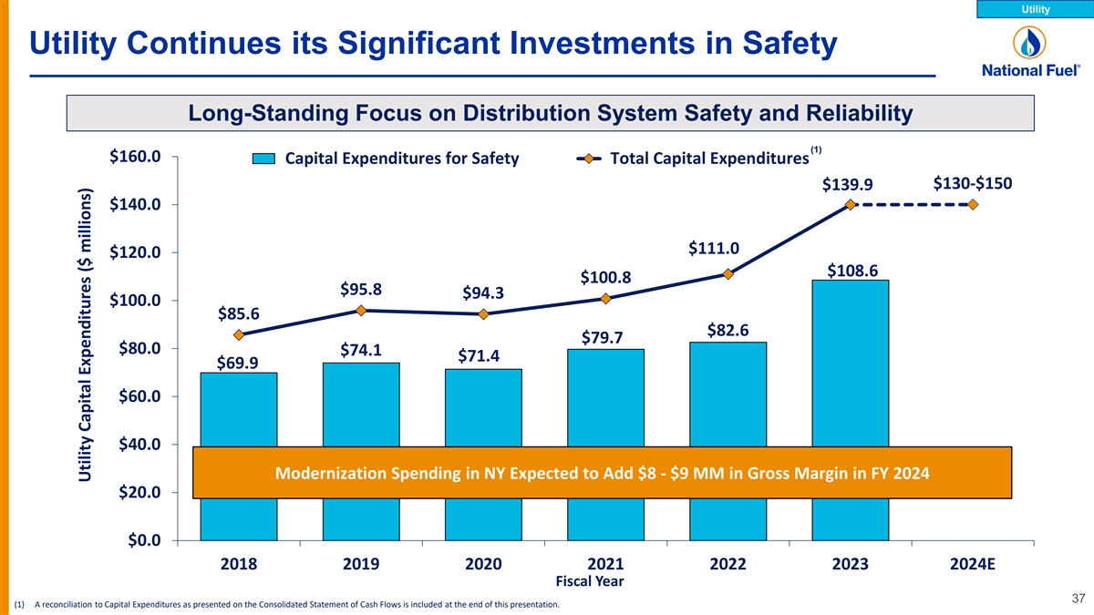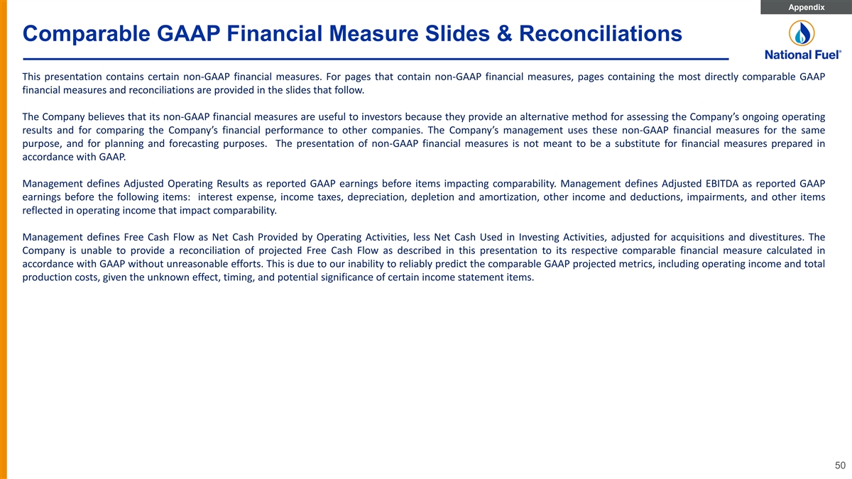 Appendix Safe Harbor For Forward Looking Statements This presentation may contain “forward-looking statements” as defined by the Private Securities Litigation Reform Act of 1995, including statements regarding future prospects, plans, objectives, goals, projections, estimates of gas quantities, strategies, future events or performance and underlying assumptions, capital structure, anticipated capital expenditures, completion of construction projects, projections for pension and other post-retirement benefit obligations, impacts of the adoption of new accounting rules, and possible outcomes of litigation or regulatory proceedings, as well as statements that are identified by the use of the words “anticipates,” “estimates,” “expects,” “forecasts,” “intends,” “plans,” “predicts,” “projects,” “believes,” “seeks,” “will,” “may,” and similar expressions. Forward-looking statements involve risks and uncertainties which could cause actual results or outcomes to differ materially from those expressed in the forward-looking statements. The Company’s expectations, beliefs and projections are expressed in good faith and are believed by the Company to have a reasonable basis, but there can be no assurance that management’s expectations, beliefs or projections will result or be achieved or accomplished. In addition to other factors, the following are important factors that could cause actual results to differ materially from those discussed in the forward-looking statements: changes in laws, regulations or judicial interpretations to which the Company is subject, including those involving derivatives, taxes, safety, employment, climate change, other environmental matters, real property, and exploration and production activities such as hydraulic fracturing; governmental/regulatory actions, initiatives and proceedings, including those involving rate cases (which address, among other things, target rates of return, rate design and retained natural gas and system modernization), environmental/safety requirements, affiliate relationships, industry structure, and franchise renewal; the Company’s ability to estimate accurately the time and resources necessary to meet emissions targets; governmental/regulatory actions and/or market pressures to reduce or eliminate reliance on natural gas; changes in economic conditions, including inflationary pressures, supply chain issues, liquidity challenges, and global, national or regional recessions, and their effect on the demand for, and customers’ ability to pay for, the Company’s products and services; changes in the price of natural gas; the creditworthiness or performance of the Company’s key suppliers, customers and counterparties; financial and economic conditions, including the availability of credit, and occurrences affecting the Company’s ability to obtain financing on acceptable terms for working capital, capital expenditures and other investments, including any downgrades in the Company’s credit ratings and changes in interest rates and other capital market conditions; impairments under the SEC’s full cost ceiling test for natural gas reserves; increased costs or delays or changes in plans with respect to Company projects or related projects of other companies, as well as difficulties or delays in obtaining necessary governmental approvals, permits or orders or in obtaining the cooperation of interconnecting facility operators; the Company’s ability to complete planned strategic transactions; changes in price differentials between similar quantities of natural gas sold at different geographic locations, and the effect of such changes on commodity production, revenues and demand for pipeline transportation capacity to or from such locations; the impact of information technology disruptions, cybersecurity or data security breaches; factors affecting the Company’s ability to successfully identify, drill for and produce economically viable natural gas reserves, including among others geology, lease availability and costs, title disputes, weather conditions, shortages, delays or unavailability of equipment and services required in drilling operations, insufficient gathering, processing and transportation capacity, the need to obtain governmental approvals and permits, and compliance with environmental laws and regulations; increasing health care costs and the resulting effect on health insurance premiums and on the obligation to provide other post-retirement benefits; other changes in price differentials between similar quantities of natural gas having different quality, heating value, hydrocarbon mix or delivery date; the cost and effects of legal and administrative claims against the Company or activist shareholder campaigns to effect changes at the Company; negotiations with the collective bargaining units representing the Company's workforce, including potential work stoppages during negotiations; uncertainty of natural gas reserve estimates; significant differences between the Company’s projected and actual production levels for natural gas; changes in demographic patterns and weather conditions (including those related to climate change); changes in the availability, price or accounting treatment of derivative financial instruments; changes in laws, actuarial assumptions, the interest rate environment and the return on plan/trust assets related to the Company’s pension and other post-retirement benefits, which can affect future funding obligations and costs and plan liabilities; economic disruptions or uninsured losses resulting from major accidents, fires, severe weather, natural disasters, terrorist activities or acts of war, as well as economic and operational disruptions due to third-party outages; significant differences between the Company’s projected and actual capital expenditures and operating expenses; or increasing costs of insurance, changes in coverage and the abi