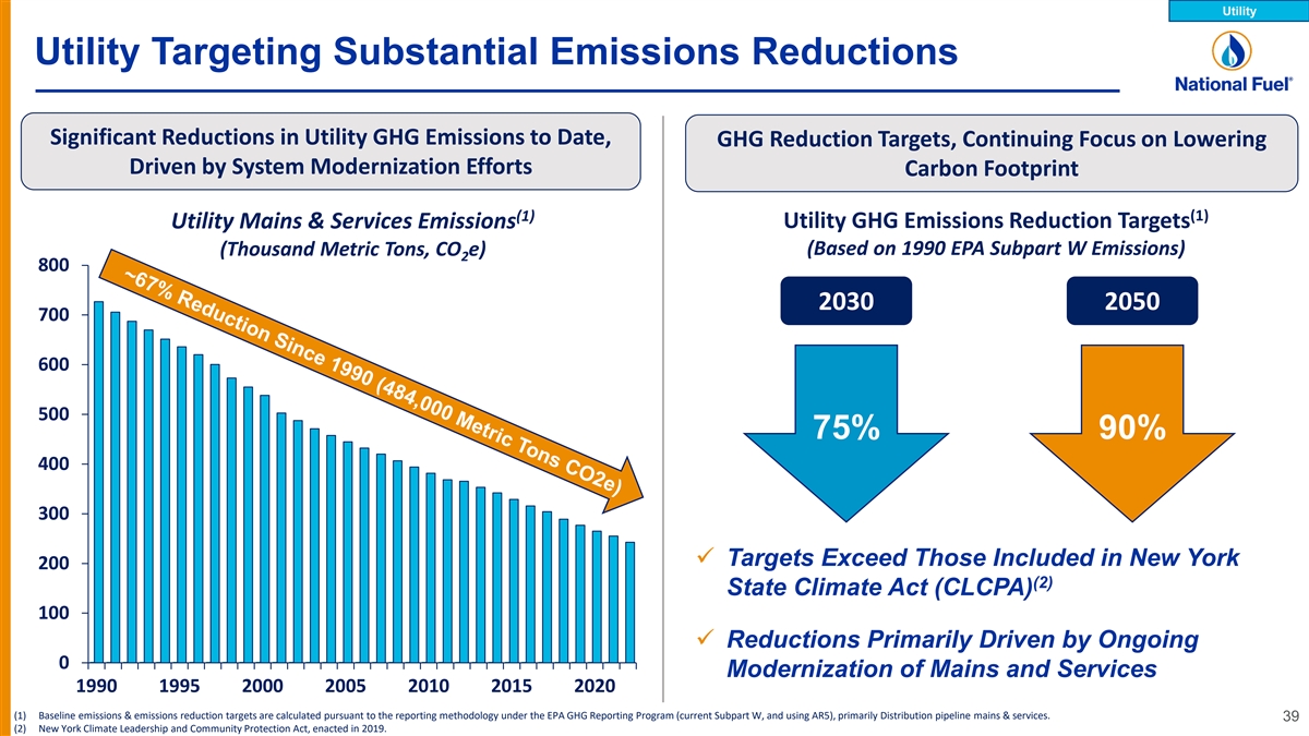 Utility Long-Standing Pipeline Replacement & Modernization (1) Utility Mains by Material Miles of Utility Main Pipeline Replaced Wrought Iron 161 158 156 154 154 Coated Bare 49 NY 45 43 40 41 9,798 miles Plastic 114 113 113 113 Wrought Iron 112 Bare Coated PA 4,845 miles Plastic 2019 2020 2021 2022 2023 Calendar Year 38 (1) All values are reported on a calendar year basis as of December 31, 2022.