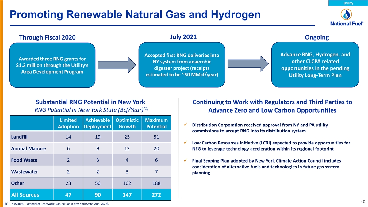Utility Promoting Renewable Natural Gas and Hydrogen July 2021 Through Fiscal 2020 Ongoing Advance RNG, Hydrogen, and Accepted first RNG deliveries into Awarded three RNG grants for other CLCPA related NY system from anaerobic $1.2 million through the Utility’s digester project (receipts opportunities in the pending Area Development Program estimated to be ~50 MMcf/year) Utility Long-Term Plan Substantial RNG Potential in New York Continuing to Work with Regulators and Third Parties to (1) RNG Potential in New York State (Bcf/Year) Advance Zero and Low Carbon Opportunities Limited Achievable Optimistic Maximum ü Distribution Corporation received approval from NY and PA utility Adoption Deployment Growth Potential commissions to accept RNG into its distribution system Landfill 14 19 25 51 ü Low Carbon Resources Initiative (LCRI) expected to provide opportunities for Animal Manure 6 9 12 20 NFG to leverage technology acceleration within its regional footprint Food Waste 2 3 4 6 ü Final Scoping Plan adopted by New York Climate Action Council includes consideration of alternative fuels and technologies in future gas system Wastewater 2 2 3 7 planning Other 23 56 102 188 All Sources 47 90 147 272 40 (1) NYSERDA– Potential of Renewable Natural Gas in New York State (April 2022).
