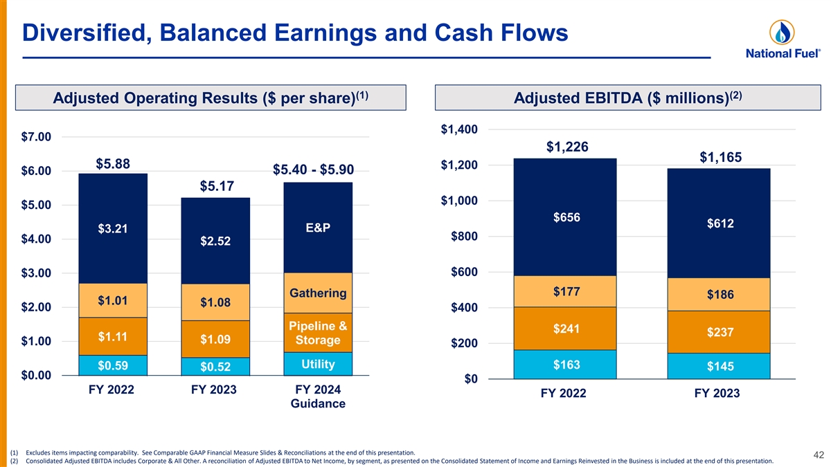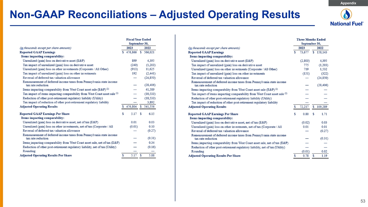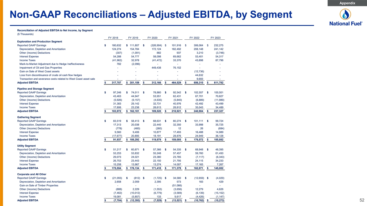 Appendix Non-GAAP Reconciliations – Adjusted EBITDA, by Segment Reconciliation of Adjusted EBITDA to Net Income, by Segment ($ Thousands) FY 2018 FY 2019 FY 2020 FY 2021 FY 2022 FY 2023 Exploration and Production Segment Reported GAAP Earnings $ 180,632 $ 111,807 $ (326,904) $ 101,916 $ 306,064 $ 232,275 Depreciation, Depletion and Amortization 124,274 154,784 172,124 182,492 208,148 241,142 Other (Income) Deductions (307) (1,091) 882 937 3,210 (3,748) Interest Expense 54,288 54,777 58,098 69,662 53,401 54,317 Income Taxes (41,962) 32,978 (41,472) 33,370 43,898 87,796 Mark-to-Market Adjustment due to Hedge Ineffectiveness 782 (2,096) - - - - Impairment of Oil and Gas Properties - - 449, 438 76,152 - - Gain on Sale of West Coast assets - - - - (12,736) - Loss from discontinuance of crude oil cash flow hedges - - - - 44,632 - Transaction and severance costs related to West Coast asset sale - - - - 9,693 - Adjusted EBITDA $ 317,707 $ 351,159 $ 312,166 $ 464,529 $ 656,310 $ 611,782 Pipeline and Storage Segment Reported GAAP Earnings $ 97,246 $ 74,011 $ 78,860 $ 92,542 $ 102,557 $ 100,501 Depreciation, Depletion and Amortization 43,463 44,947 53,951 62,431 67,701 70,827 Other (Income) Deductions (5,926) (9,157) (4,635) (5,840) (6,889) (11,989) Interest Expense 31,383 29,142 32,731 40,976 42,492 43,499 Income Taxes 17,806 23,238 28,613 28,812 35,043 34,489 Adjusted EBITDA $ 183,972 $ 162,181 $ 189,520 $ 218,921 $ 240,904 $ 237,327 Gathering Segment Reported GAAP Earnings $ 83,519 $ 58,413 $ 68,631 $ 80,274 $ 101,111 $ 99,724 Depreciation, Depletion and Amortization 17,313 20,038 22,440 32,350 33,998 35,725 Other (Income) Deductions (778) (460) (260) 12 26 (684) Interest Expense 9,560 9,406 10,877 17,493 16,488 14,989 Income Taxes (17,677) 20,895 18,191 28,876 24,949 36,128 Adjusted EBITDA $ 91,937 $ 108,292 $ 119,879 $ 159,005 $ 176,572 $ 185,882 Utility Segment Reported GAAP Earnings $ 51,217 $ 60,871 $ 57,366 $ 54,335 $ 68,948 $ 48,395 Depreciation, Depletion and Amortization 53,253 53,832 55,248 57,457 59,760 61,450 Other (Income) Deductions 29,073 24,021 23,380 23,785 (7,117) (6,343) Interest Expense 26,753 23,443 22,150 21,795 24,115 34,233 Income Taxes 15,258 13,967 13,274 14,007 17,165 7,267 Adjusted EBITDA $ 175,554 $ 176,134 $ 171,418 $ 171,379 $ 162,871 $ 145,002 Corporate and All Other Reported GAAP Earnings $ (21,093) $ (812) $ (1,725) $ 34,580 $ (12,659) $ (4,029) Depreciation, Depletion and Amortization 2,658 2,059 2,395 573 183 429 Gain on Sale of Timber Properties - - - (51,066) - - Other (Income) Deductions (888) 2,229 (1,553) (3,656) 12,279 4,626 Interest Expense (7,462) (10,012) (6,779) (3,569) (6,139) (15,152) Income Taxes 19,081 (5,857) 133 9,617 (4,426) (1,147) Adjusted EBITDA $ (7,704) $ (12,393) $ (7,529) $ (13,521) $ (10,762) $ (15,273) 52
