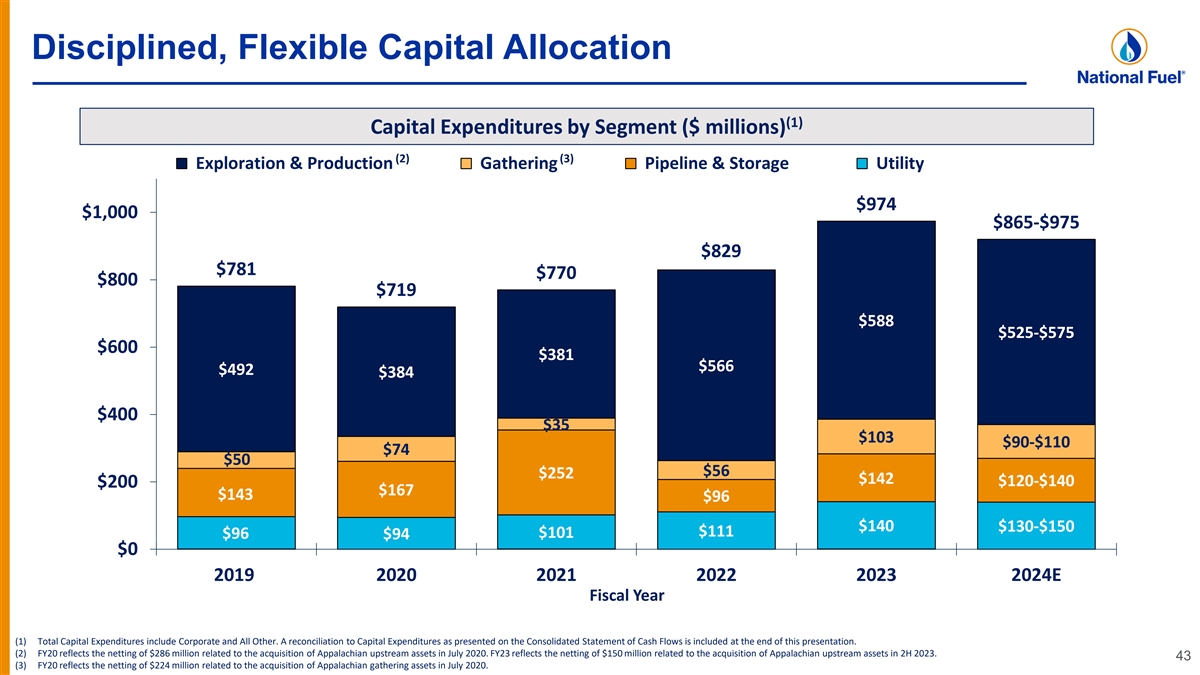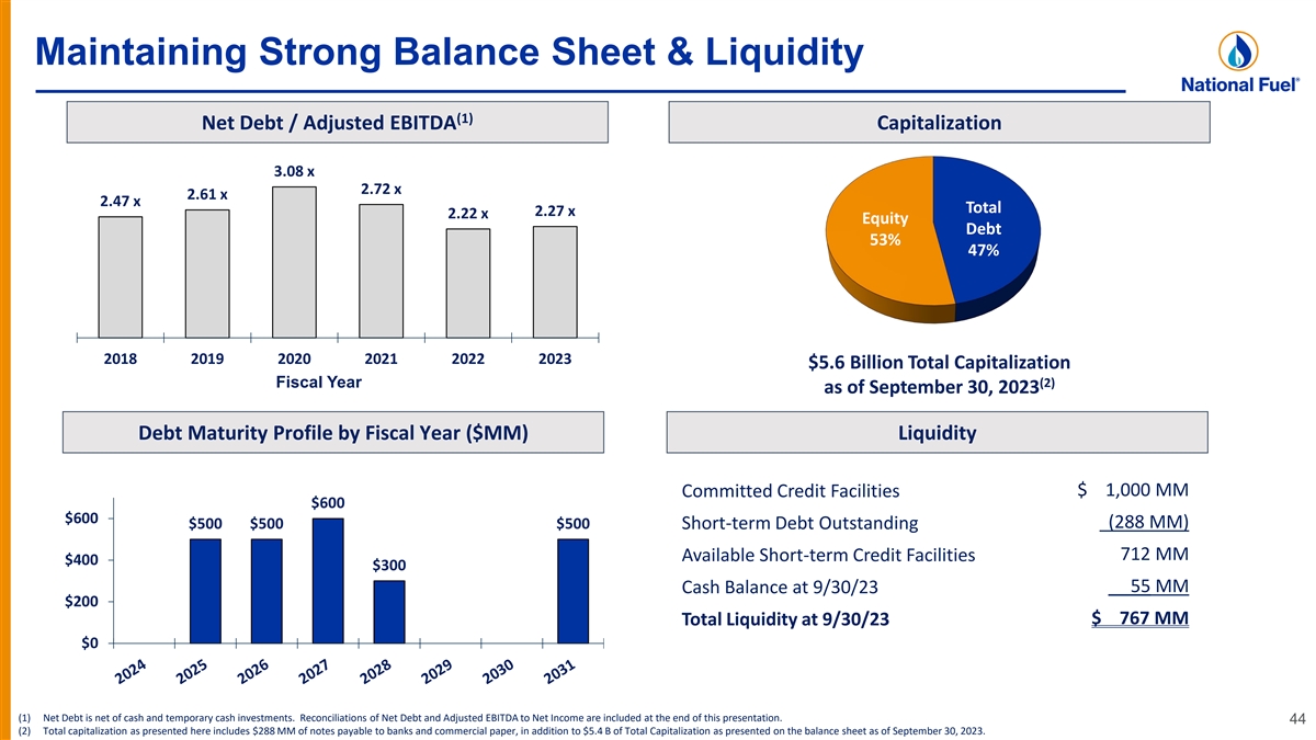 Disciplined, Flexible Capital Allocation (1) Capital Expenditures by Segment ($ millions) (2) (3) Exploration & Production Gathering Pipeline & Storage Utility $974 $1,000 $865-$975 $829 $781 $770 $800 $719 $588 $525-$575 $600 $381 $566 $492 $384 $400 $35 $103 $90-$110 $74 $50 $56 $252 $142 $120-$140 $200 $167 $143 $96 $140 $130-$150 $111 $101 $96 $94 $0 2019 2020 2021 2022 2023 2024E Fiscal Year (1) Total Capital Expenditures include Corporate and All Other. A reconciliation to Capital Expenditures as presented on the Consolidated Statement of Cash Flows is included at the end of this presentation. (2) FY20 reflects the netting of $286 million related to the acquisition of Appalachian upstream assets in July 2020. FY23 reflects the netting of $150 million related to the acquisition of Appalachian upstream assets in 2H 2023. 43 (3) FY20 reflects the netting of $224 million related to the acquisition of Appalachian gathering assets in July 2020.