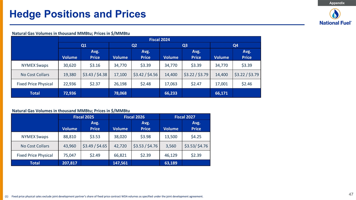 Appendix Hedge Positions and Prices Natural Gas Volumes in thousand MMBtu; Prices in $/MMBtu Fiscal 2024 Q1 Q2 Q3 Q4 Avg. Avg. Avg. Avg. Volume Price Volume Price Volume Price Volume Price NYMEX Swaps 30,620 $3.16 34,770 $3.39 34,770 $3.39 34,770 $3.39 No Cost Collars 19,380 $3.43 / $4.38 17,100 $3.42 / $4.56 14,400 $3.22 / $3.79 14,400 $3.22 / $3.79 Fixed Price Physical 22,936 $2.37 26,198 $2.48 17,063 $2.47 17,001 $2.46 Total 72,936 78,068 66,233 66,171 Natural Gas Volumes in thousand MMBtu; Prices in $/MMBtu Fiscal 2025 Fiscal 2026 Fiscal 2027 Avg. Avg. Avg. Volume Price Volume Price Volume Price NYMEX Swaps 88,810 $3.53 38,020 $3.98 13,500 $4.25 No Cost Collars 43,960 $3.49 / $4.65 42,720 $3.53 / $4.76 3,560 $3.53/ $4.76 Fixed Price Physical 75,047 $2.49 66,821 $2.39 46,129 $2.39 Total 207,817 147,561 63,189 47 (1) Fixed price physical sales exclude joint development partner’s share of fixed price contract WDA volumes as specified under the joint development agreement.