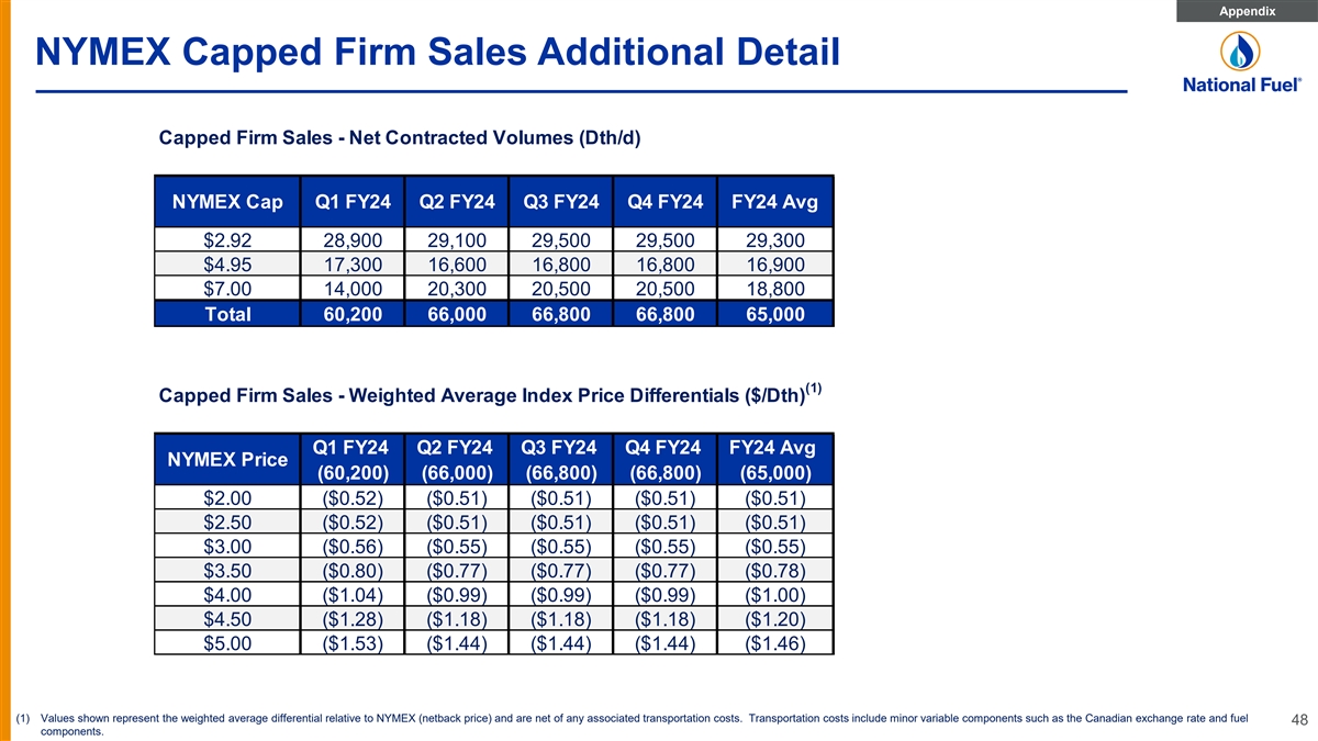 Appendix NYMEX Capped Firm Sales Additional Detail Capped Firm Sales - Net Contracted Volumes (Dth/d) NYMEX Cap Q1 FY24 Q2 FY24 Q3 FY24 Q4 FY24 FY24 Avg $2.92 28,900 29,100 29,500 29,500 29,300 $4.95 17,300 16,600 16,800 16,800 16,900 $7.00 14,000 20,300 20,500 20,500 18,800 Total 60,200 66,000 66,800 66,800 65,000 (1) Capped Firm Sales - Weighted Average Index Price Differentials ($/Dth) Q1 FY24 Q2 FY24 Q3 FY24 Q4 FY24 FY24 Avg NYMEX Price (60,200) (66,000) (66,800) (66,800) (65,000) $2.00 ($0.52) ($0.51) ($0.51) ($0.51) ($0.51) $2.50 ($0.52) ($0.51) ($0.51) ($0.51) ($0.51) $3.00 ($0.56) ($0.55) ($0.55) ($0.55) ($0.55) $3.50 ($0.80) ($0.77) ($0.77) ($0.77) ($0.78) $4.00 ($1.04) ($0.99) ($0.99) ($0.99) ($1.00) $4.50 ($1.28) ($1.18) ($1.18) ($1.18) ($1.20) $5.00 ($1.53) ($1.44) ($1.44) ($1.44) ($1.46) (1) Values shown represent the weighted average differential relative to NYMEX (netback price) and are net of any associated transportation costs. Transportation costs include minor variable components such as the Canadian exchange rate and fuel 48 components.