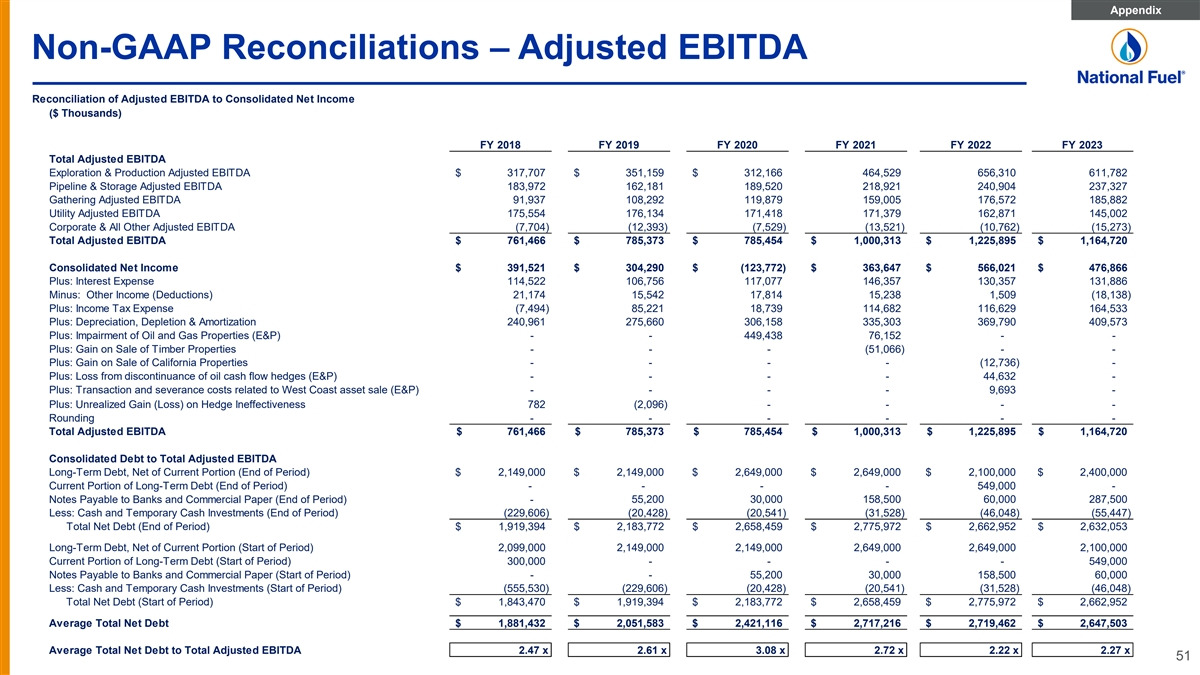 Appendix Non-GAAP Reconciliations – Adjusted EBITDA Reconciliation of Adjusted EBITDA to Consolidated Net Income ($ Thousands) FY 2018 FY 2019 FY 2020 FY 2021 FY 2022 FY 2023 Total Adjusted EBITDA Exploration & Production Adjusted EBITDA $ 317,707 $ 351,159 $ 312,166 464,529 656,310 611,782 Pipeline & Storage Adjusted EBITDA 183,972 162,181 189,520 218,921 240,904 237,327 Gathering Adjusted EBITDA 91,937 108,292 119,879 159,005 176,572 185,882 Utility Adjusted EBITDA 175,554 176,134 171,418 171,379 162,871 145,002 Corporate & All Other Adjusted EBITDA (7,704) (12,393) (7,529) (13,521) (10,762) (15,273) Total Adjusted EBITDA $ 761,466 $ 785,373 $ 785,454 $ 1,000,313 $ 1,225,895 $ 1,164,720 Consolidated Net Income $ 391,521 $ 304,290 $ (123,772) $ 363,647 $ 566,021 $ 476,866 Plus: Interest Expense 114,522 106,756 117,077 146,357 130,357 131,886 Minus: Other Income (Deductions) 21,174 15,542 17,814 15,238 1,509 (18,138) Plus: Income Tax Expense (7,494) 85,221 18,739 114,682 116,629 164,533 Plus: Depreciation, Depletion & Amortization 240,961 275,660 306,158 335,303 369,790 409,573 Plus: Impairment of Oil and Gas Properties (E&P) - - 449,438 76,152 - - Plus: Gain on Sale of Timber Properties - - - (51,066) - - Plus: Gain on Sale of California Properties - - - - (12,736) - Plus: Loss from discontinuance of oil cash flow hedges (E&P) - - - - 44,632 - Plus: Transaction and severance costs related to West Coast asset sale (E&P) - - - - 9,693 - Plus: Unrealized Gain (Loss) on Hedge Ineffectiveness 782 (2,096) - - - - Rounding - - - - - - Total Adjusted EBITDA $ 761,466 $ 785,373 $ 785,454 $ 1,000,313 $ 1,225,895 $ 1,164,720 Consolidated Debt to Total Adjusted EBITDA Long-Term Debt, Net of Current Portion (End of Period) $ 2,149,000 $ 2,149,000 $ 2,649,000 $ 2,649,000 $ 2,100,000 $ 2,400,000 Current Portion of Long-Term Debt (End of Period) - - - - 549,000 - Notes Payable to Banks and Commercial Paper (End of Period) - 55,200 30,000 158,500 60,000 287,500 Less: Cash and Temporary Cash Investments (End of Period) (229,606) (20,428) (20,541) (31,528) (46,048) (55,447) Total Net Debt (End of Period) $ 1,919,394 $ 2,183,772 $ 2,658,459 $ 2,775,972 $ 2,662,952 $ 2,632,053 Long-Term Debt, Net of Current Portion (Start of Period) 2,099,000 2,149,000 2,149,000 2,649,000 2,649,000 2,100,000 Current Portion of Long-Term Debt (Start of Period) 300,000 - - - - 549,000 Notes Payable to Banks and Commercial Paper (Start of Period) - - 55,200 30,000 158,500 60,000 Less: Cash and Temporary Cash Investments (Start of Period) (555,530) (229,606) (20,428) (20,541) (31,528) (46,048) Total Net Debt (Start of Period) $ 1,843,470 $ 1,919,394 $ 2,183,772 $ 2,658,459 $ 2,775,972 $ 2,662,952 Average Total Net Debt $ 1,881,432 $ 2,051,583 $ 2,421,116 $ 2,717,216 $ 2,719,462 $ 2,647,503 Average Total Net Debt to Total Adjusted EBITDA 2.47 x 2.61 x 3.08 x 2.72 x 2.22 x 2.27 x 51