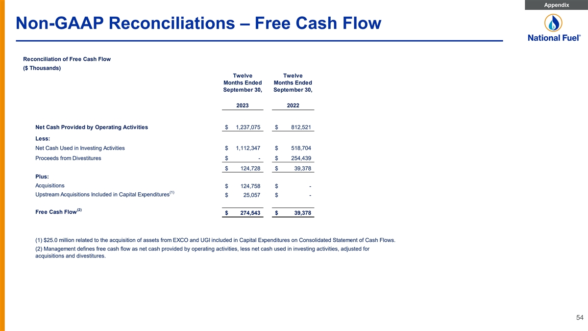 Appendix Non-GAAP Reconciliations – Free Cash Flow Reconciliation of Free Cash Flow ($ Thousands) Twelve Twelve Months Ended Months Ended September 30, September 30, 2023 2022 Net Cash Provided by Operating Activities $ 1,237,075 $ 812,521 Less: Net Cash Used in Investing Activities $ 1,112,347 $ 518,704 Proceeds from Divestitures $ - $ 254,439 $ 124,728 $ 39,378 Plus: Acquisitions $ 124,758 $ - (1) Upstream Acquisitions Included in Capital Expenditures $ 25,057 $ - (2) Free Cash Flow $ 274,543 $ 39,378 (1) $25.0 million related to the acquisition of assets from EXCO and UGI included in Capital Expenditures on Consolidated Statement of Cash Flows. (2) Management defines free cash flow as net cash provided by operating activities, less net cash used in investing activities, adjusted for acquisitions and divestitures. 54