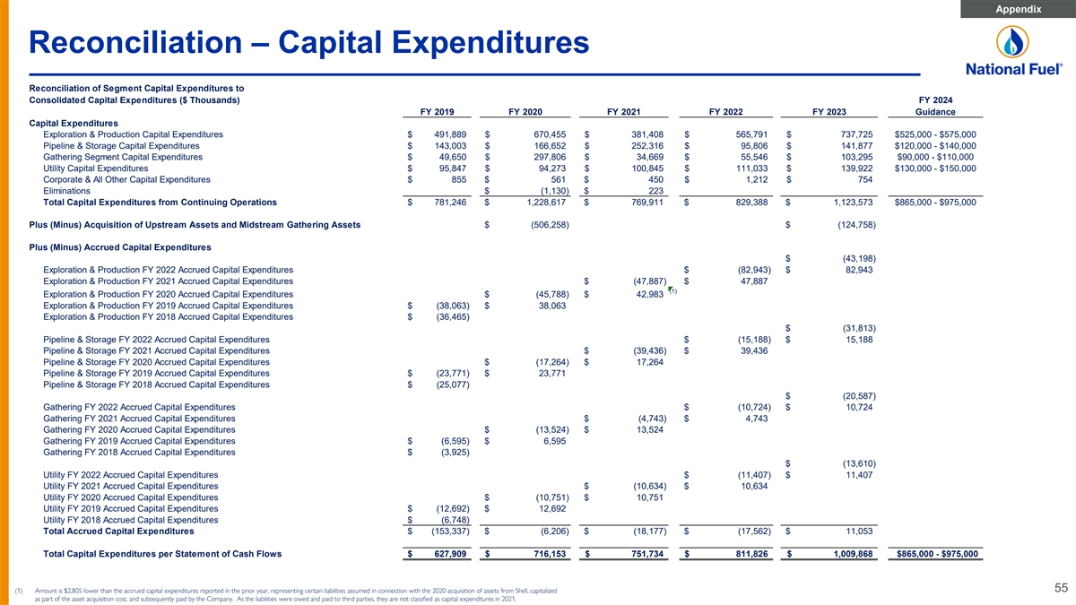 Appendix Reconciliation – Capital Expenditures Reconciliation of Segment Capital Expenditures to Consolidated Capital Expenditures ($ Thousands) FY 2024 FY 2019 FY 2020 FY 2021 FY 2022 FY 2023 Guidance Capital Expenditures Exploration & Production Capital Expenditures $ 491,889 $ 670,455 $ 381,408 $ 565,791 $ 737,725 $525,000 - $575,000 Pipeline & Storage Capital Expenditures $ 143,003 $ 166,652 $ 252,316 $ 95,806 $ 141,877 $120,000 - $140,000 Gathering Segment Capital Expenditures $ 49,650 $ 297,806 $ 34,669 $ 55,546 $ 103,295 $90,000 - $110,000 Utility Capital Expenditures $ 95,847 $ 94,273 $ 100,845 $ 111,033 $ 139,922 $130,000 - $150,000 Corporate & All Other Capital Expenditures $ 855 $ 561 $ 450 $ 1,212 $ 754 Eliminations $ (1,130) $ 223 Total Capital Expenditures from Continuing Operations $ 781,246 $ 1,228,617 $ 769,911 $ 829,388 $ 1,123,573 $865,000 - $975,000 Plus (Minus) Acquisition of Upstream Assets and Midstream Gathering Assets $ (506,2 58) $ (124,758) Plus (Minus) Accrued Capital Expenditures $ (43,198) Exploration & Production FY 2022 Accrued Capital Expenditures $ (82,943) $ 82,943 Exploration & Production FY 2021 Accrued Capital Expenditures $ (47,887) $ 47,887 (1) Exploration & Production FY 2020 Accrued Capital Expenditures $ (45,78 8) $ 42,983 Exploration & Production FY 2019 Accrued Capital Expenditures $ (38,063) $ 38,063 Exploration & Production FY 2018 Accrued Capital Expenditures $ (36,465) $ (31,813) Pipeline & Storage FY 2022 Accrued Capital Expenditures $ (15,18 8) $ 15,188 Pipeline & Storage FY 2021 Accrued Capital Expenditures $ (39,436) $ 39,436 Pipeline & Storage FY 2020 Accrued Capital Expenditures $ (17,264) $ 17,264 Pipeline & Storage FY 2019 Accrued Capital Expenditures $ (23,771) $ 23,771 Pipeline & Storage FY 2018 Accrued Capital Expenditures $ (25,077) $ (20,587) Gathering FY 2022 Accrued Capital Expenditures $ (10,72 4) $ 10,724 Gathering FY 2021 Accrued Capital Expenditures $ (4,743) $ 4,743 Gathering FY 2020 Accrued Capital Expenditures $ (13,52 4) $ 13,524 Gathering FY 2019 Accrued Capital Expenditures $ (6,595) $ 6,595 Gathering FY 2018 Accrued Capital Expenditures $ (3,925) $ (13,610) Utility FY 2022 Accrued Capital Expenditures $ (11,407) $ 11,407 Utility FY 2021 Accrued Capital Expenditures $ (10,634) $ 10,634 Utility FY 2020 Accrued Capital Expenditures $ (10,75 1) $ 10,751 Utility FY 2019 Accrued Capital Expenditures $ (12,692) $ 12,692 Utility FY 2018 Accrued Capital Expenditures $ (6,748) Total Accrued Capital Expenditures $ (153,337) $ (6,206 ) $ (18,177) $ (17,56 2) $ 11,053 Total Capital Expenditures per Statement of Cash Flows $ 627,909 $ 716,153 $ 751,734 $ 811,826 $ 1,009,868 $865,000 - $975,000 (1) Amount is $2,805 lower than the accrued capital expenditures reported in the prior year, representing certain liabilities assumed in connection with the 2020 acquisition of assets from Shell, capitalized 55 as part of the asset acquisition cost, and subsequently paid by the Company. As the liabilities were owed and paid to third parties, they are not classified as capital expenditures in 2021.