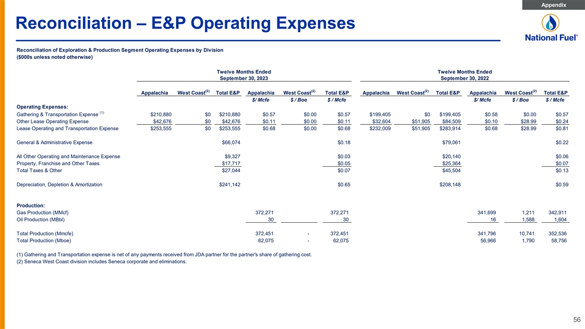 Appendix Reconciliation – E&P Operating Expenses Reconciliation of Exploration & Production Segment Operating Expenses by Division ($000s unless noted otherwise) Twelve Months Ended Twelve Months Ended September 30, 2023 September 30, 2022 (2) (2) (2) (2) Appalachia West Coast Total E&P Appalachia West Coast Total E&P Appalachia West Coast Total E&P Appalachia West Coast Total E&P $/ Mcfe $ / Boe $ / Mcfe $/ Mcfe $ / Boe $ / Mcfe Operating Expenses: (1) Gathering & Transportation Expense $210,880 $0 $210,880 $0.57 $0.00 $0.57 $199,405 $0 $199,405 $0.58 $0.00 $0.57 Other Lease Operating Expense $42,676 $0 $42,676 $0.11 $0.00 $0.11 $32,604 $51,905 $84,509 $0.10 $28.99 $0.24 Lease Operating and Transportation Expense $253,555 $0 $253,555 $0.68 $0.00 $0.68 $232,009 $51,905 $283,914 $0.68 $28.99 $0.81 General & Administrative Expense $66,074 $0.18 $79,061 $0.22 All Other Operating and Maintenance Expense $9,327 $0.03 $20,140 $0.06 Property, Franchise and Other Taxes $17,717 $0.05 $25,364 $0.07 Total Taxes & Other $27,044 $0.07 $45,504 $0.13 Depreciation, Depletion & Amortization $241,142 $0.65 $208,148 $0.59 Production: Gas Production (MMcf) 372,271 372,271 341,699 1,211 342,911 Oil Production (MBbl) 30 30 16 1,588 1,604 Total Production (Mmcfe) 372,451 - 372,451 341,796 10,741 352,536 Total Production (Mboe) 62,075 - 62,075 56,966 1,790 58,756 (1) Gathering and Transportation expense is net of any payments received from JDA partner for the partner's share of gathering cost. (2) Seneca West Coast division includes Seneca corporate and eliminations. 56